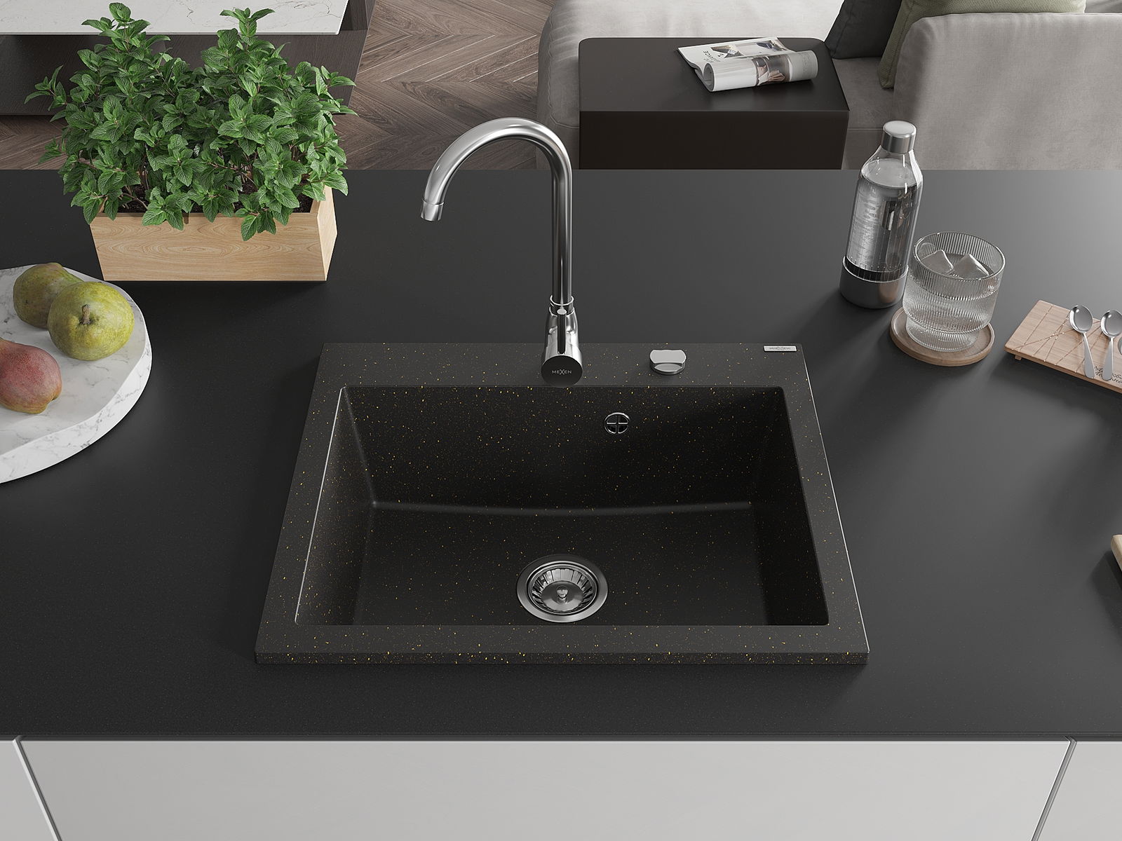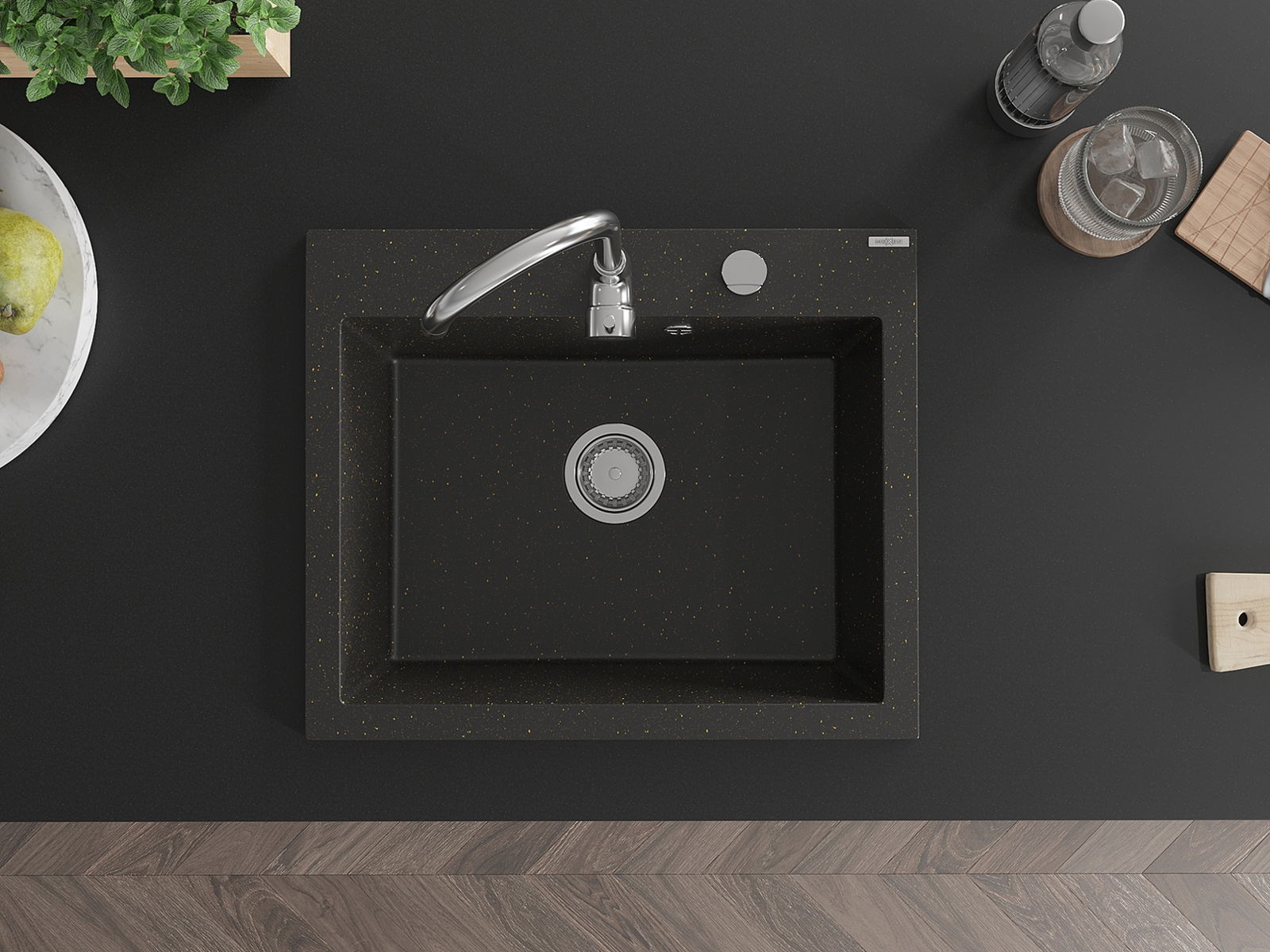 Mexen Elix granite sink 1-bowl 600 x 500 mm, black/gold metallic, chrome siphon - 6525601005-75