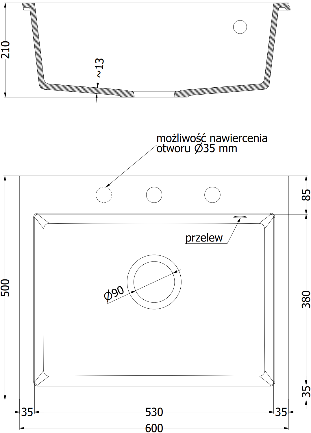 The sink has a pre-drilled 35 mm diameter hole for self-punching. It can be used, among other things, for installing a liquid dispenser, which will eliminate the presence of plastic bottles in the kitchen and give it an elegant finish.
