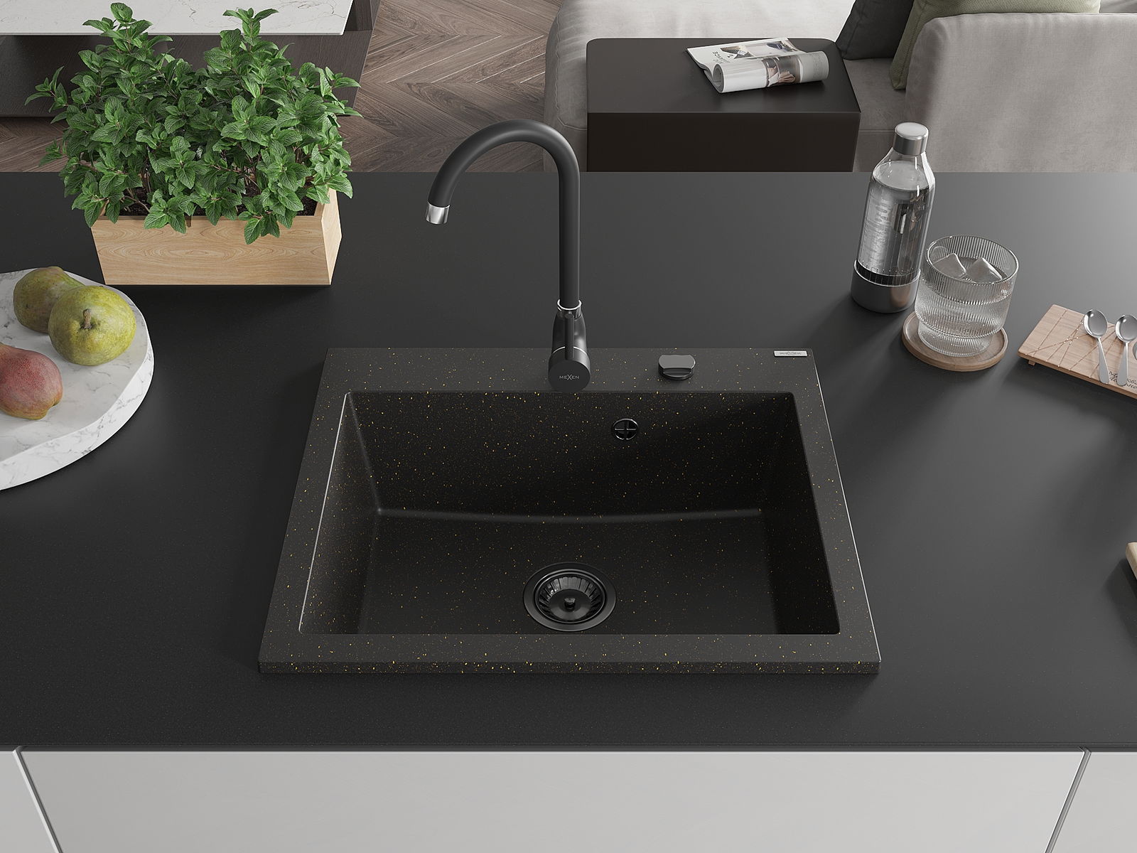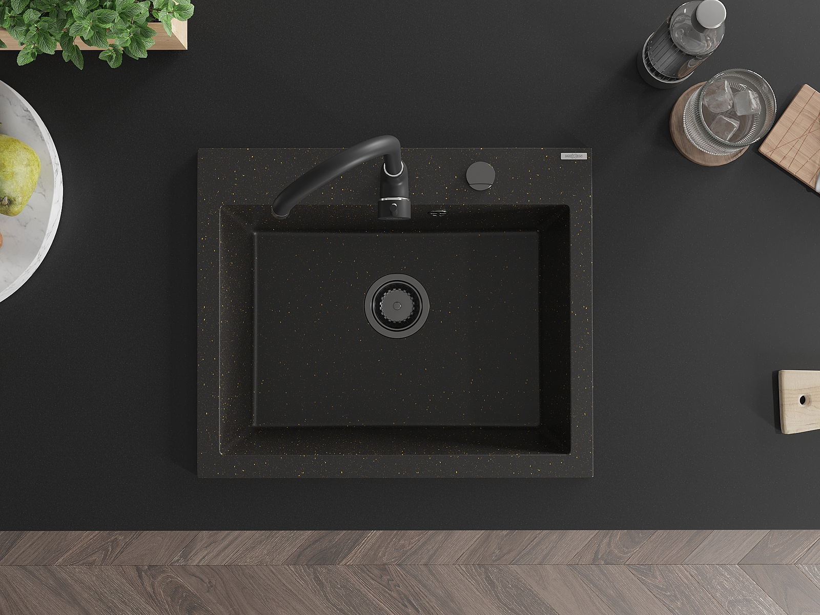 Mexen Elix granite sink 1-bowl 600 x 500 mm, black/gold metallic, black siphon - 6525601005-75-B