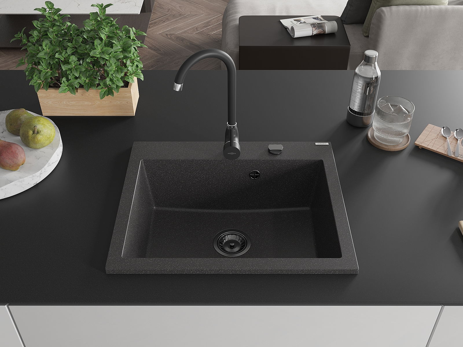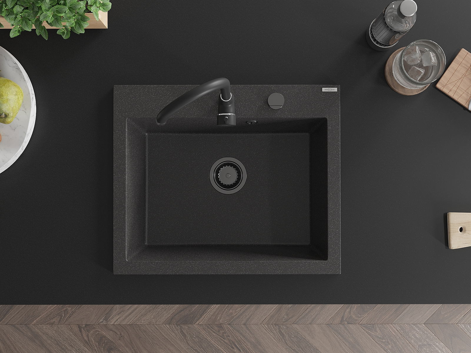 Mexen Elix 1-bowl granite sink 600 x 500 mm, black speckled, black siphon - 6525601005-76-B