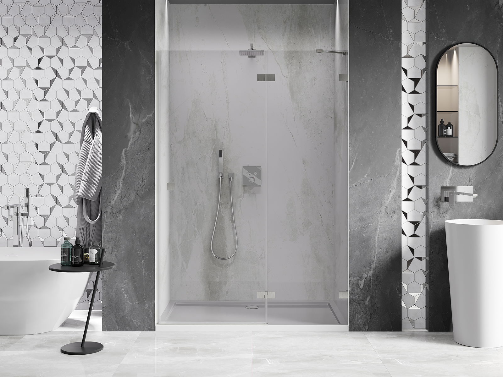 A handy and comfortable handle made from durable and resistant metal. Its trendy shape combined with a finish matched to the colour of the profiles gives the whole a modern and stylish look, highlighting the aesthetics of every bathroom.