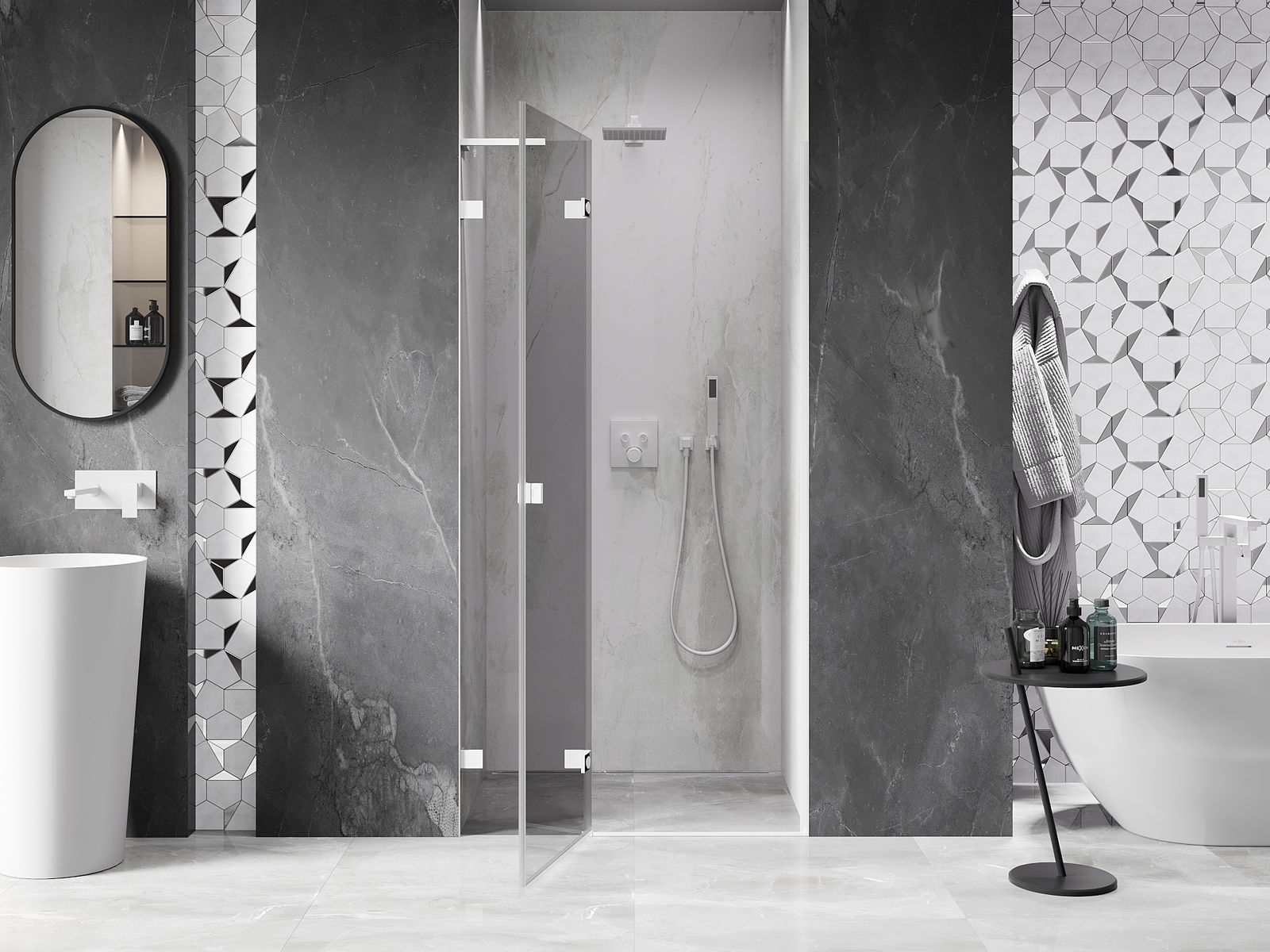 A handy and comfortable handle made from durable and resistant metal. Its trendy shape combined with a finish matched to the colour of the profiles gives the whole a modern and stylish look, highlighting the aesthetics of every bathroom.