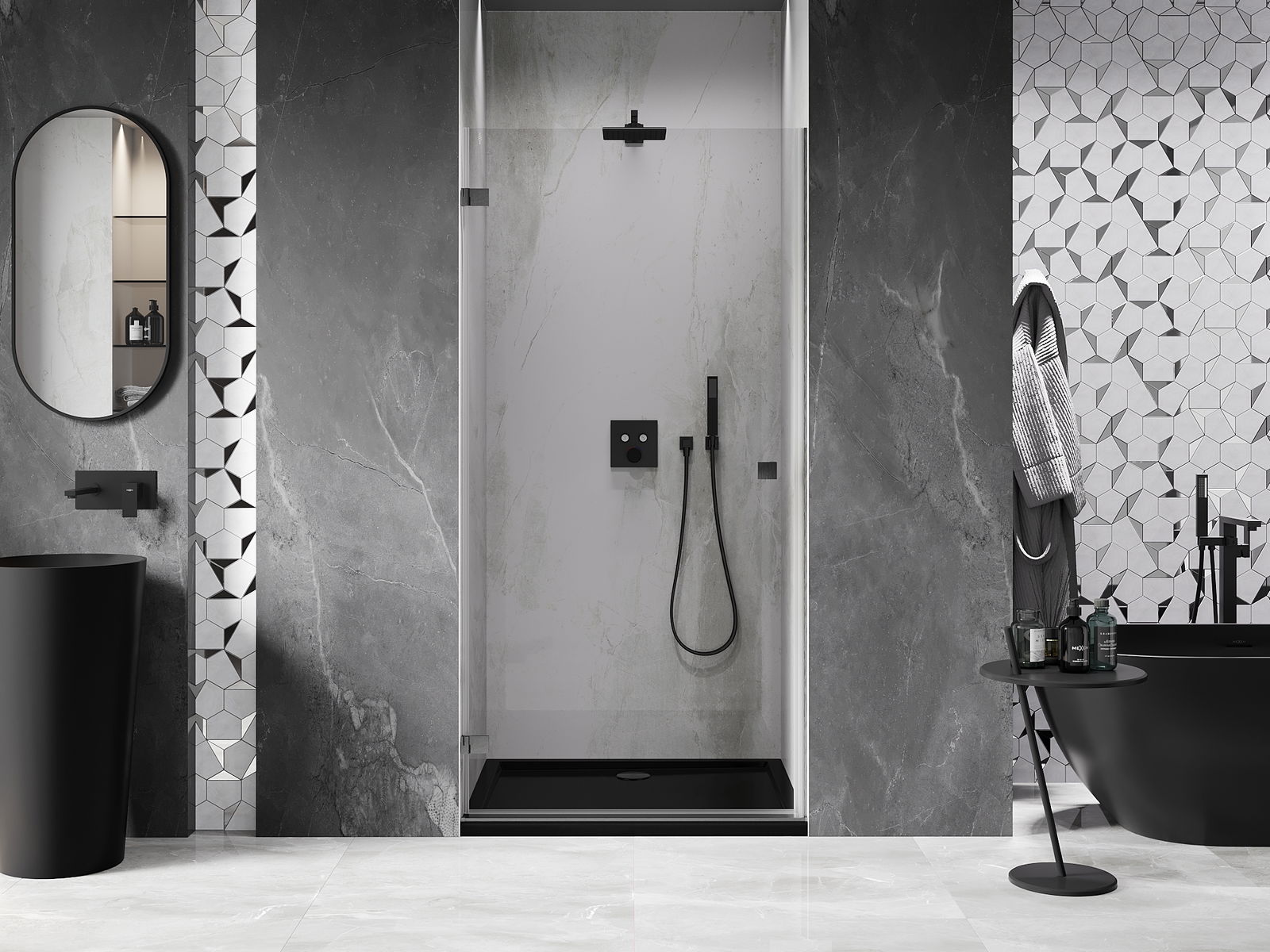 A handy and comfortable handle made from durable and resistant metal. Its trendy shape combined with a finish matched to the colour of the profiles gives the whole a modern and stylish look, highlighting the aesthetics of every bathroom.