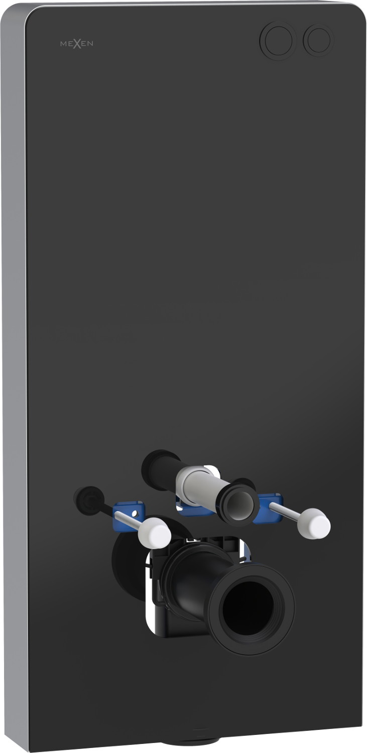 Mexen Tex Air G is an elegant surface-mounted frame with an exceptional design, perfect for modern interiors. With a glass, tempered front panel in black and brushed aluminum on the sides, the frame blends well with various bathroom styles. The product measures 103 cm in height, 50 cm in width, and 12 cm in thickness and is equipped with a pneumatic flushing button, allowing for water regulation (3/6 L). It is universal, fitting both hanging and standing bowls (holes 18 or 23 cm), making it an excellent choice for various bathroom solutions.