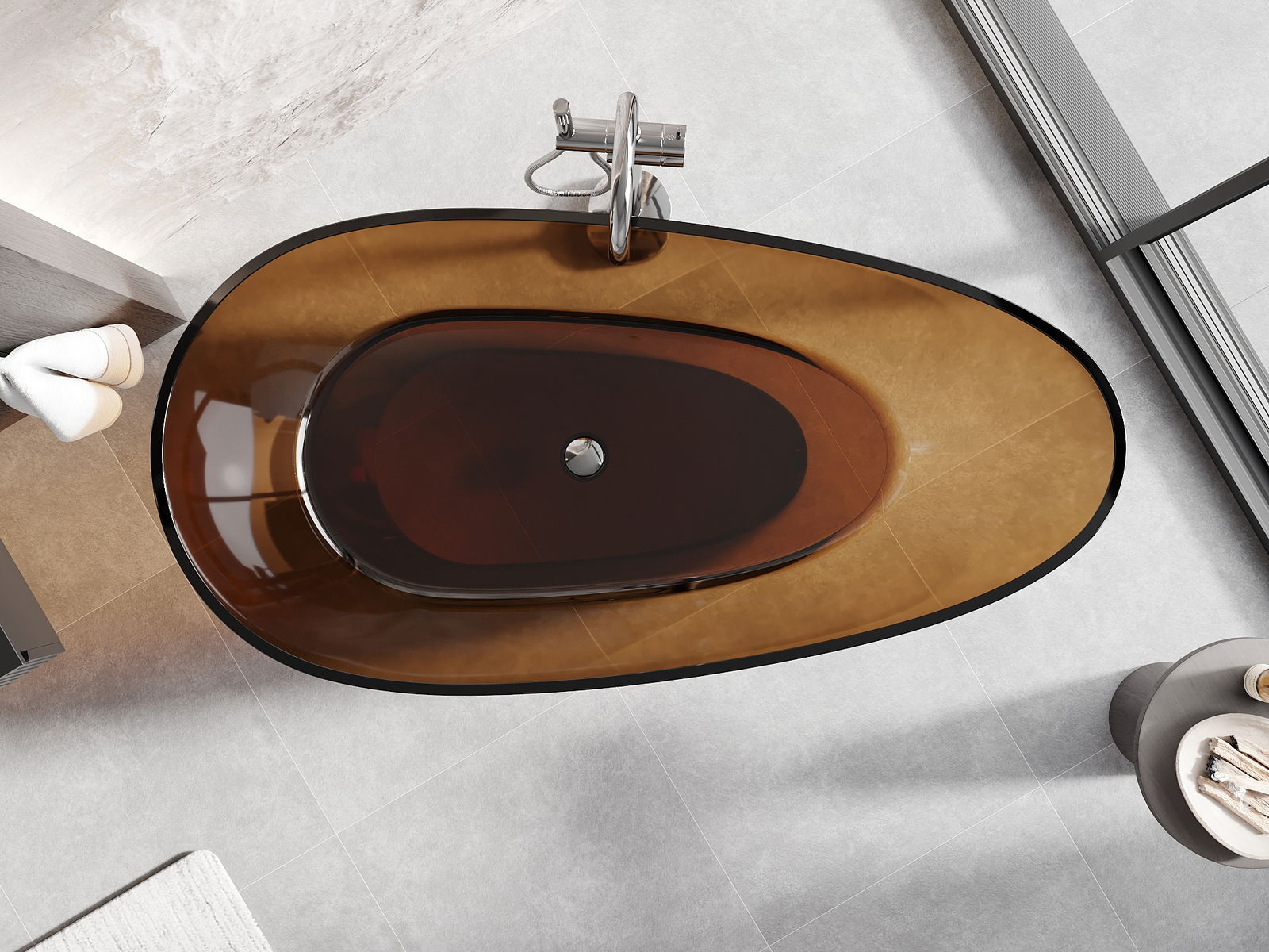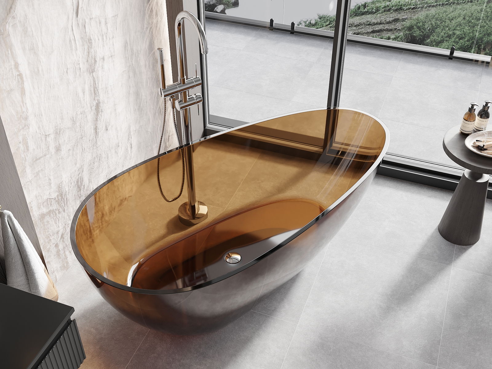 This is a modern material combining an elegant appearance with high durability. It is resistant to mechanical damage, easy to clean, and pleasant to the touch. The transparent form and thin rim of the bathtub add lightness and unique character, creating an impactful accent in bathroom design.