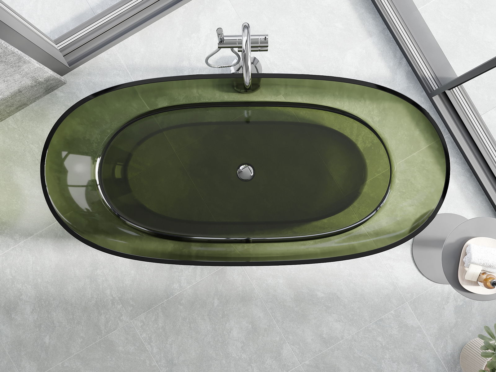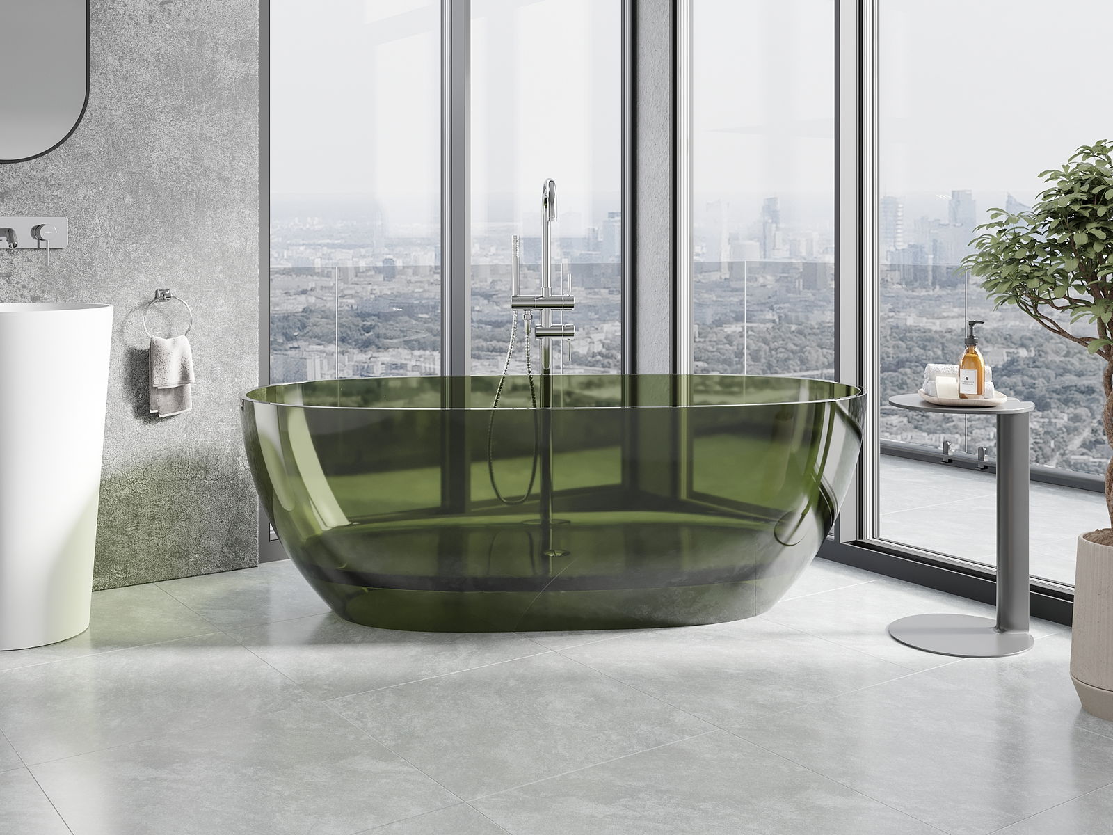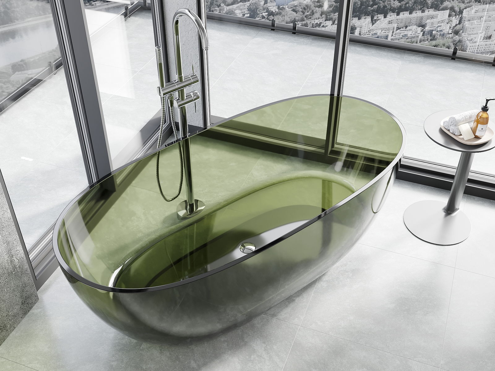 This is a modern material combining an elegant appearance with high durability. It is resistant to mechanical damage, easy to clean, and pleasant to the touch. The transparent form and thin rim of the bathtub add lightness and unique character, creating an impactful accent in bathroom design.