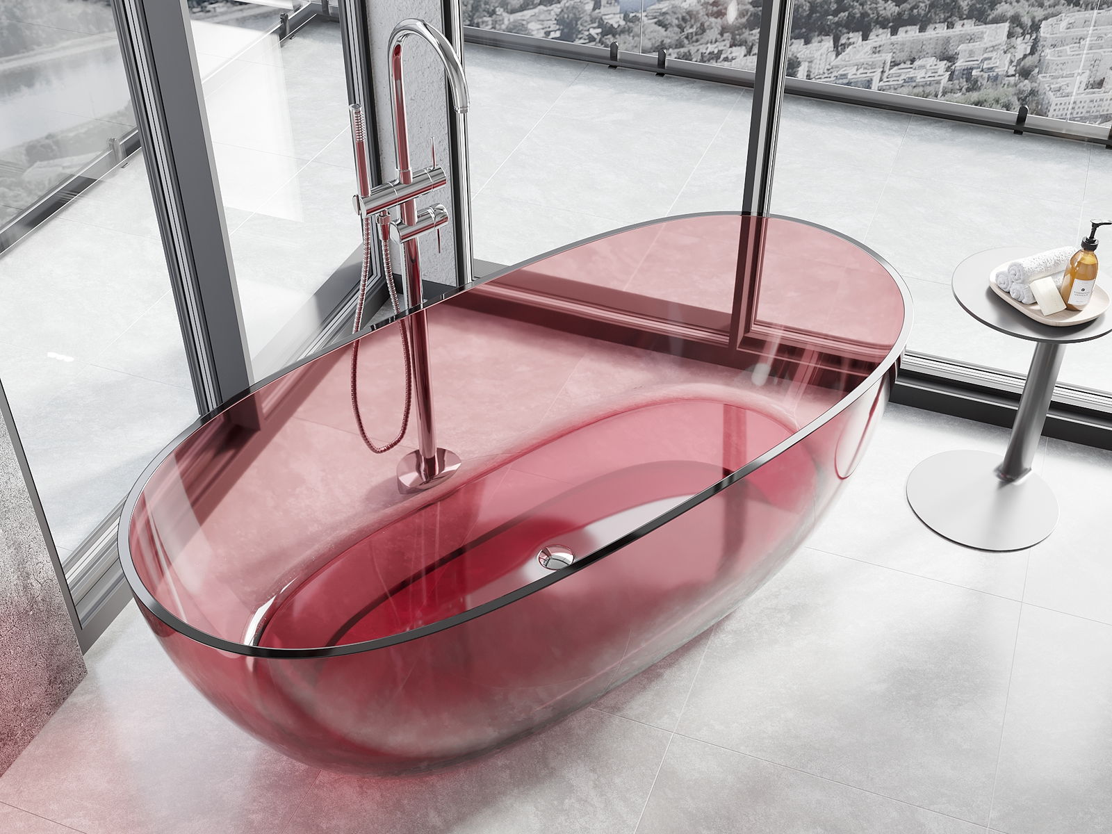 This is a modern material combining an elegant appearance with high durability. It is resistant to mechanical damage, easy to clean, and pleasant to the touch. The transparent form and thin rim of the bathtub add lightness and unique character, creating an impactful accent in bathroom design.