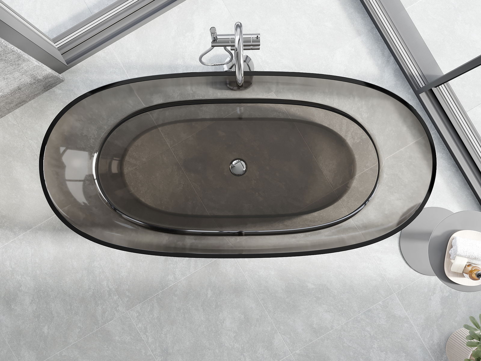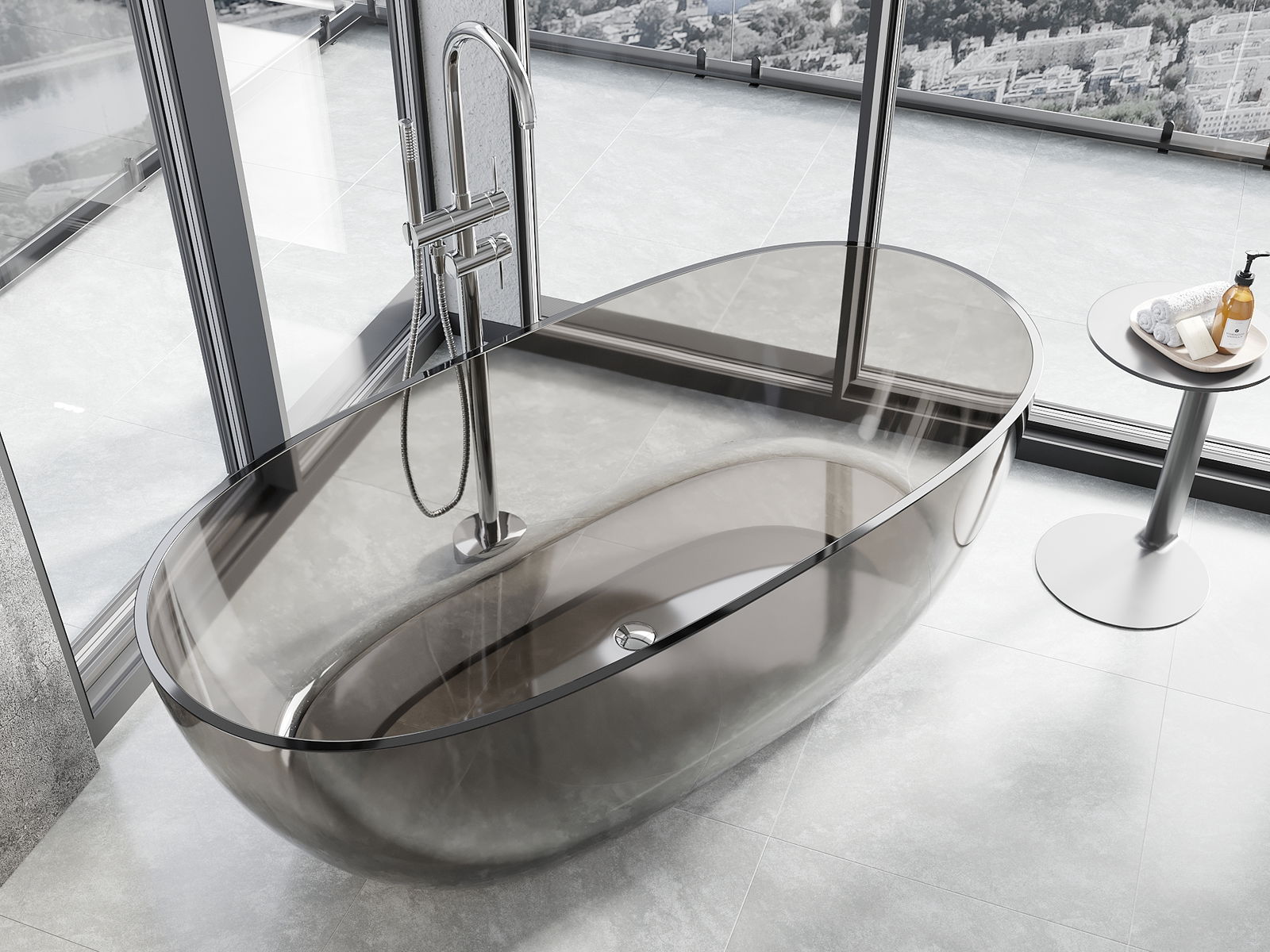 This is a modern material combining an elegant appearance with high durability. It is resistant to mechanical damage, easy to clean, and pleasant to the touch. The transparent form and thin rim of the bathtub add lightness and unique character, creating an impactful accent in bathroom design.