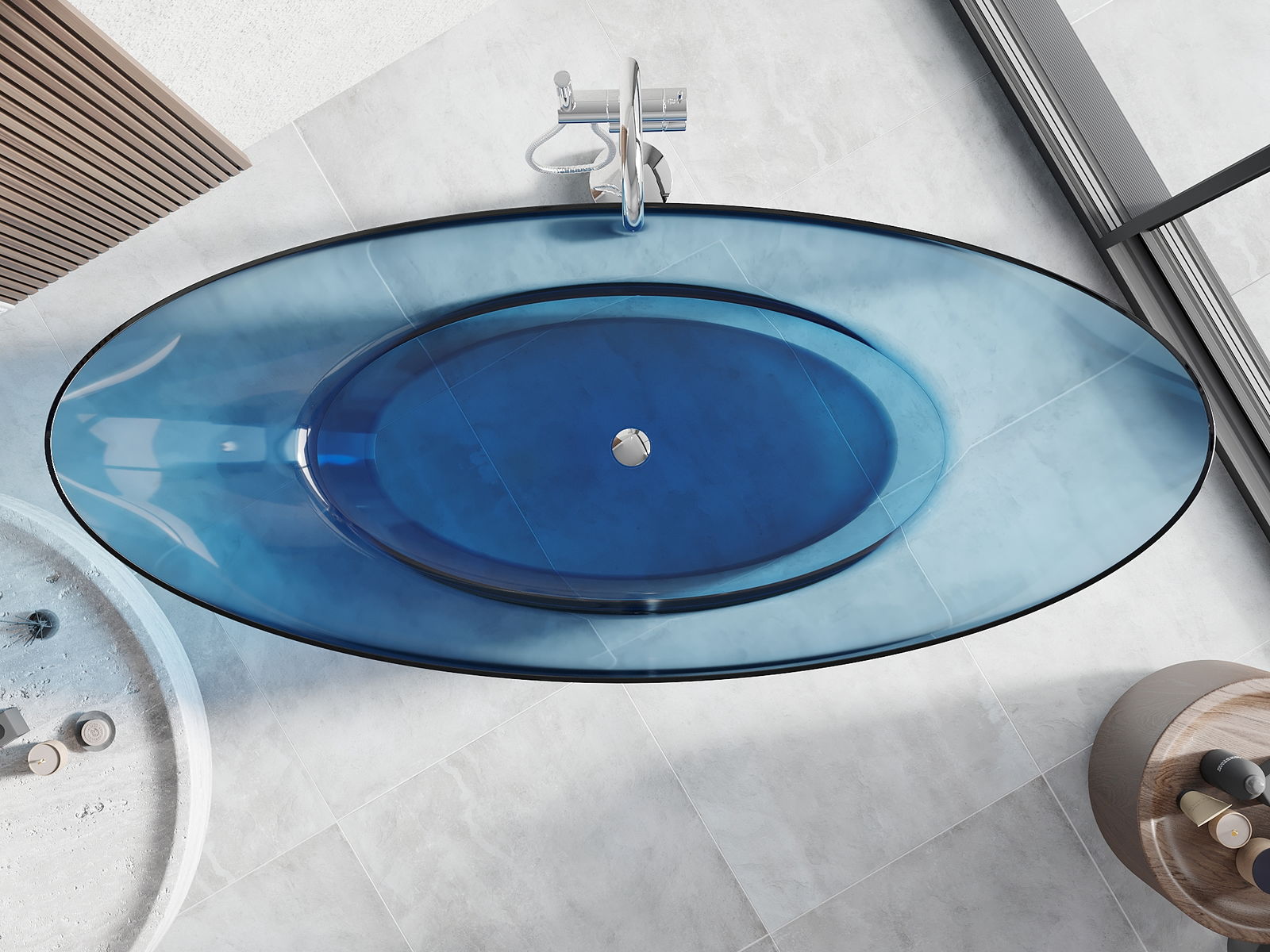This is a modern material combining an elegant appearance with high durability. It is resistant to mechanical damage, easy to clean, and pleasant to the touch. The transparent form and thin rim of the bathtub add lightness and unique character, creating an impactful accent in bathroom design.