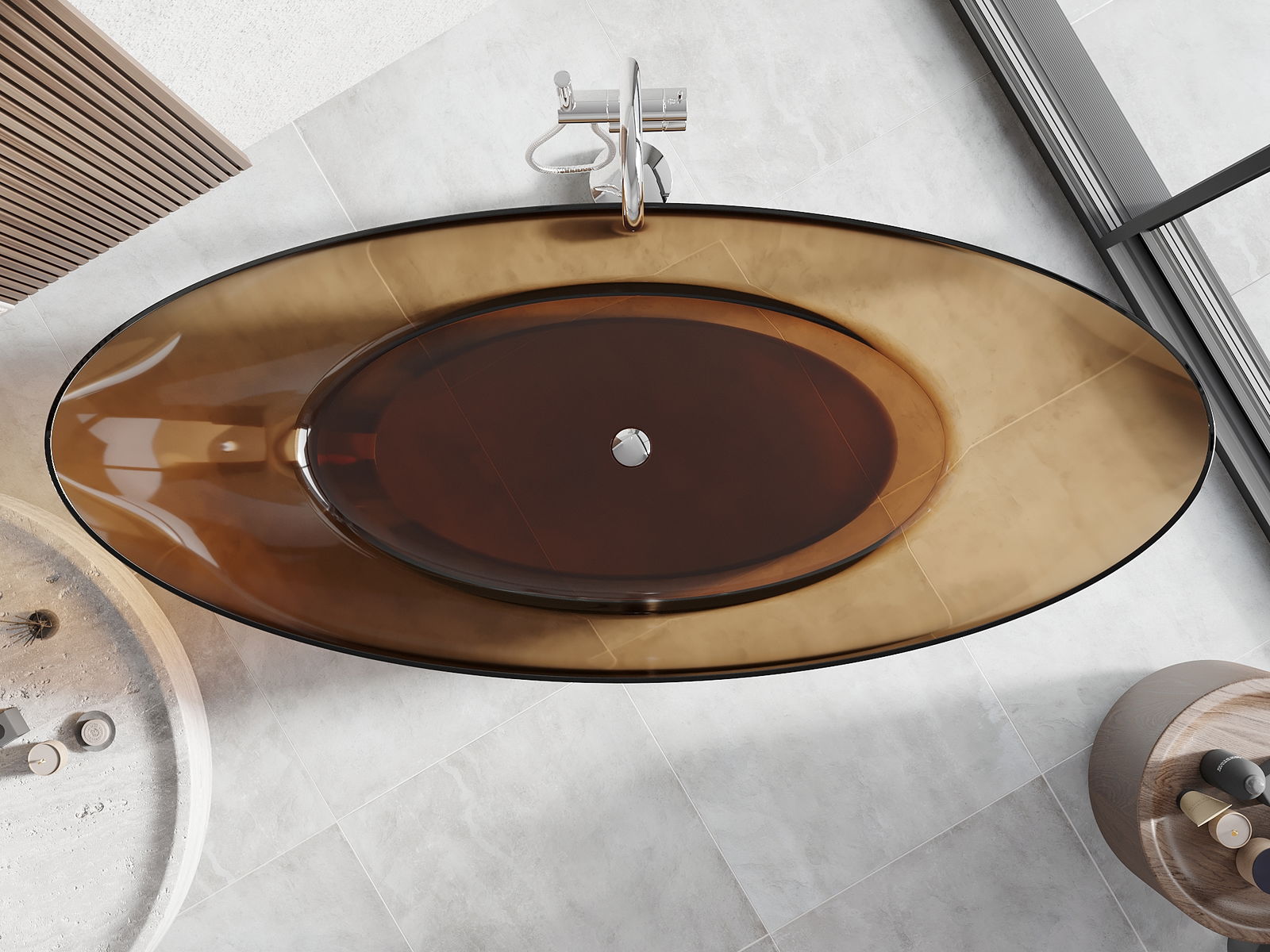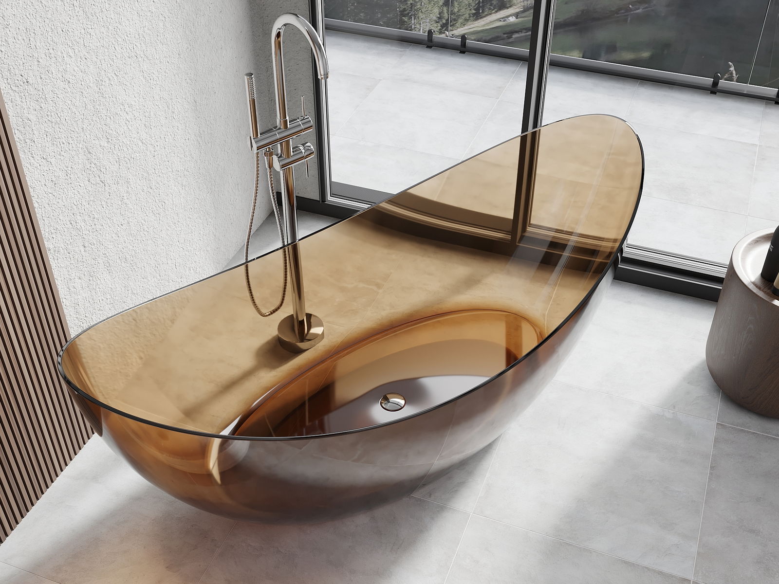 This is a modern material combining an elegant appearance with high durability. It is resistant to mechanical damage, easy to clean, and pleasant to the touch. The transparent form and thin rim of the bathtub add lightness and unique character, creating an impactful accent in bathroom design.