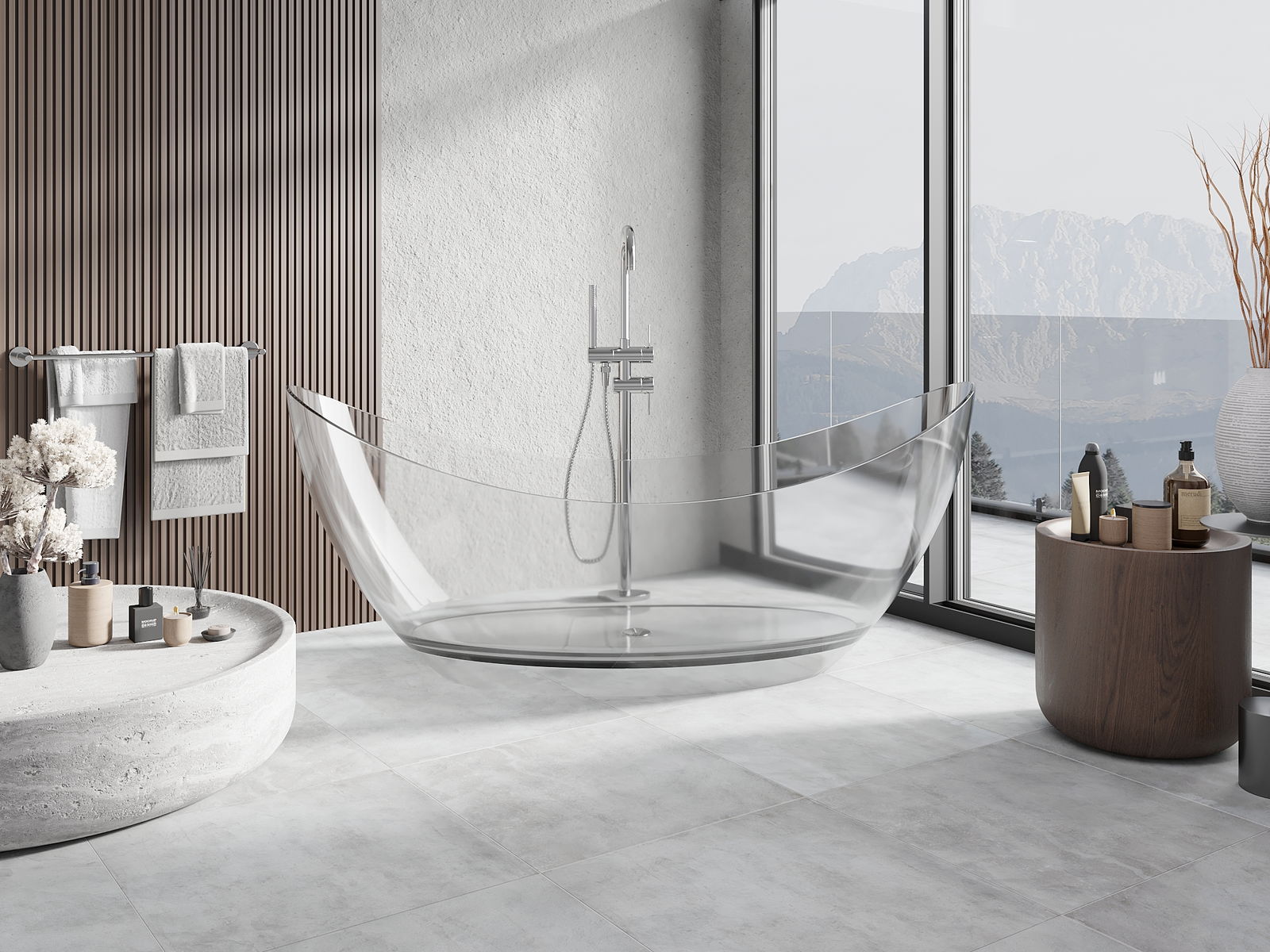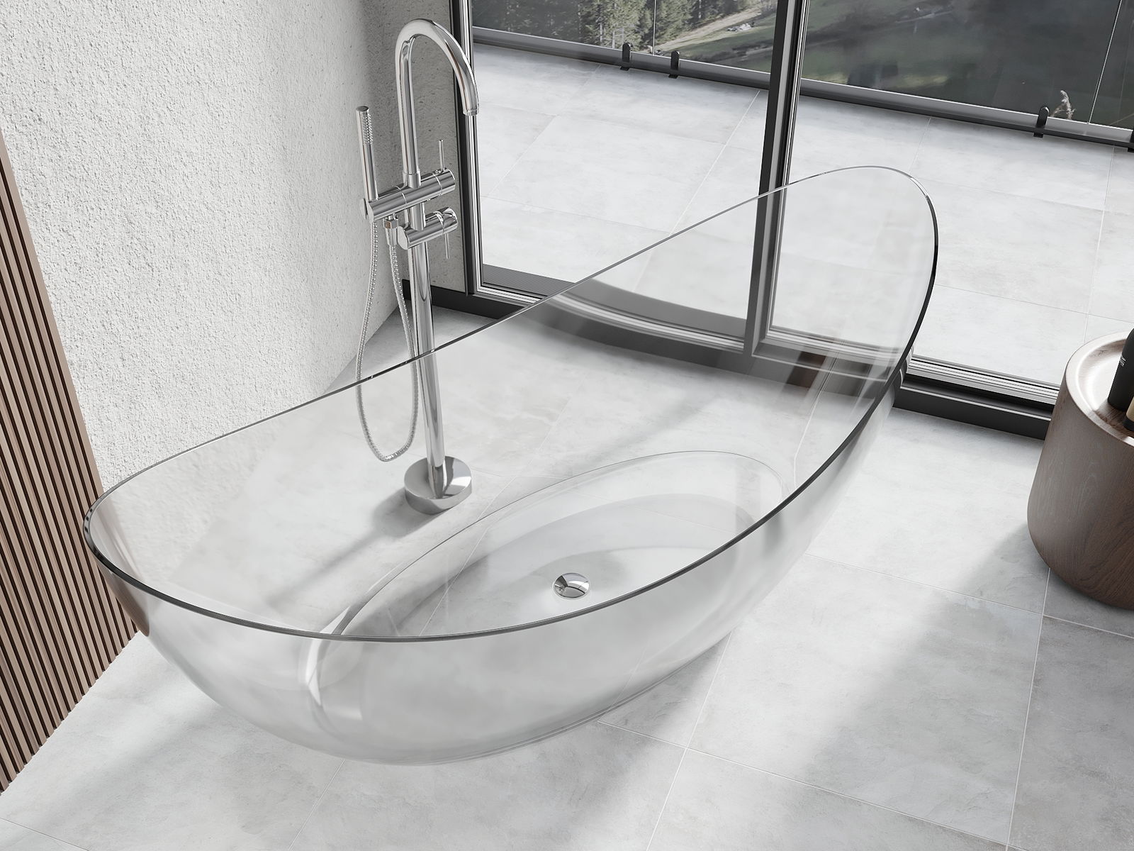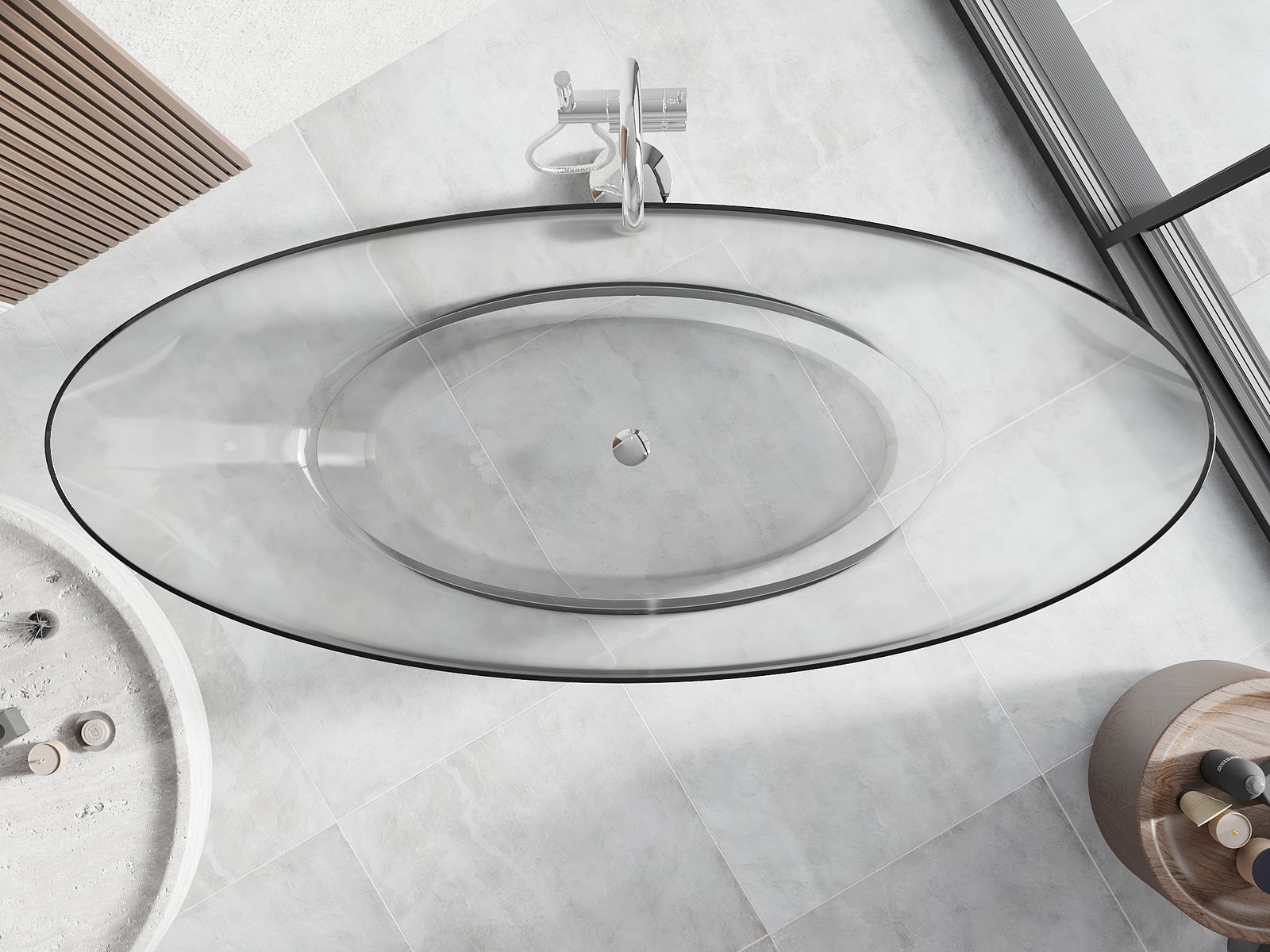 This is a modern material combining an elegant appearance with high durability. It is resistant to mechanical damage, easy to clean, and pleasant to the touch. The transparent form and thin rim of the bathtub add lightness and unique character, creating an impactful accent in bathroom design.