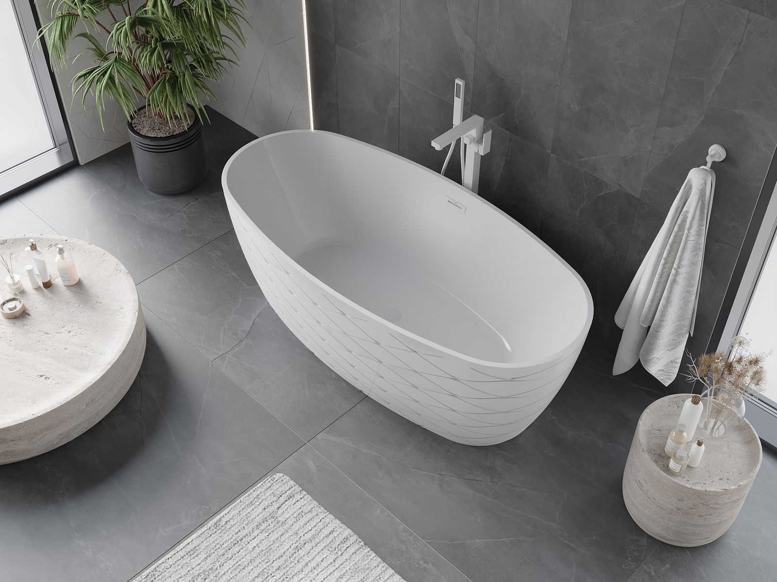 This is a modern material combining an elegant appearance with high durability. It is resistant to mechanical damage, easy to clean, and pleasant to the touch. The transparent form and thin rim of the bathtub add lightness and unique character, creating an impactful accent in bathroom design.