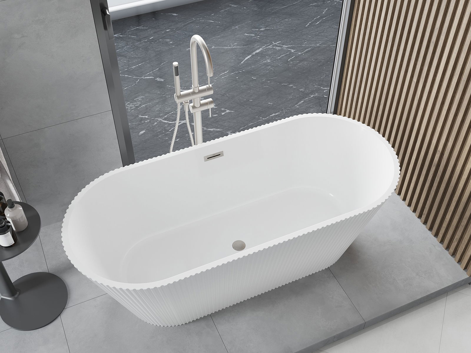 This is a modern material combining an elegant appearance with high durability. It is resistant to mechanical damage, easy to clean, and pleasant to the touch. The transparent form and thin rim of the bathtub add lightness and unique character, creating an impactful accent in bathroom design.