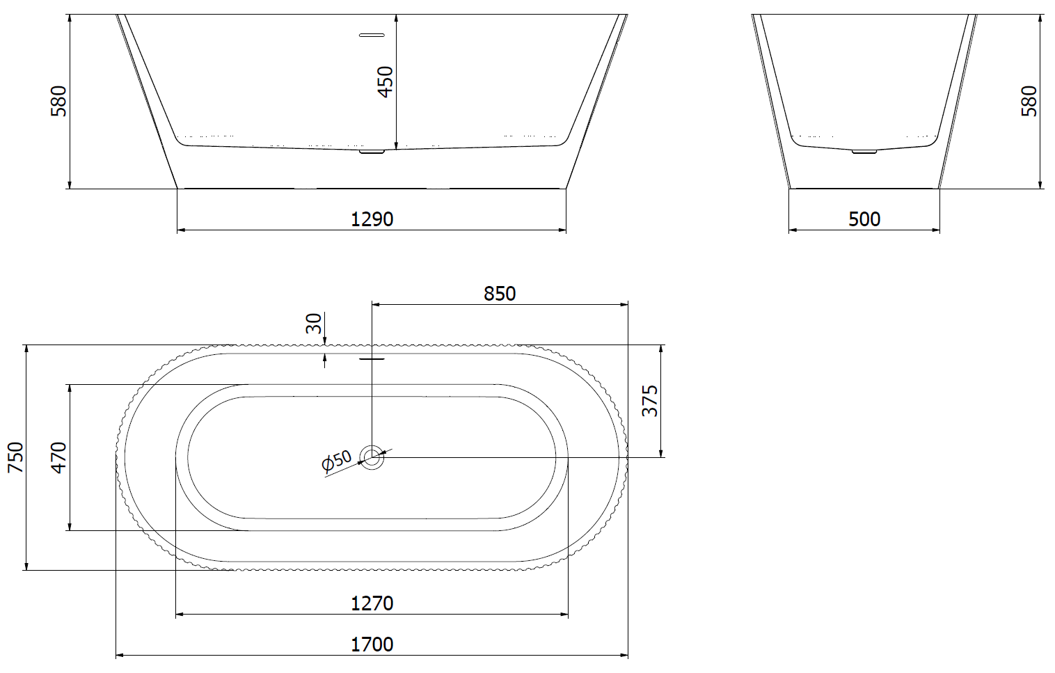 This is a modern material combining an elegant appearance with high durability. It is resistant to mechanical damage, easy to clean, and pleasant to the touch. The transparent form and thin rim of the bathtub add lightness and unique character, creating an impactful accent in bathroom design.