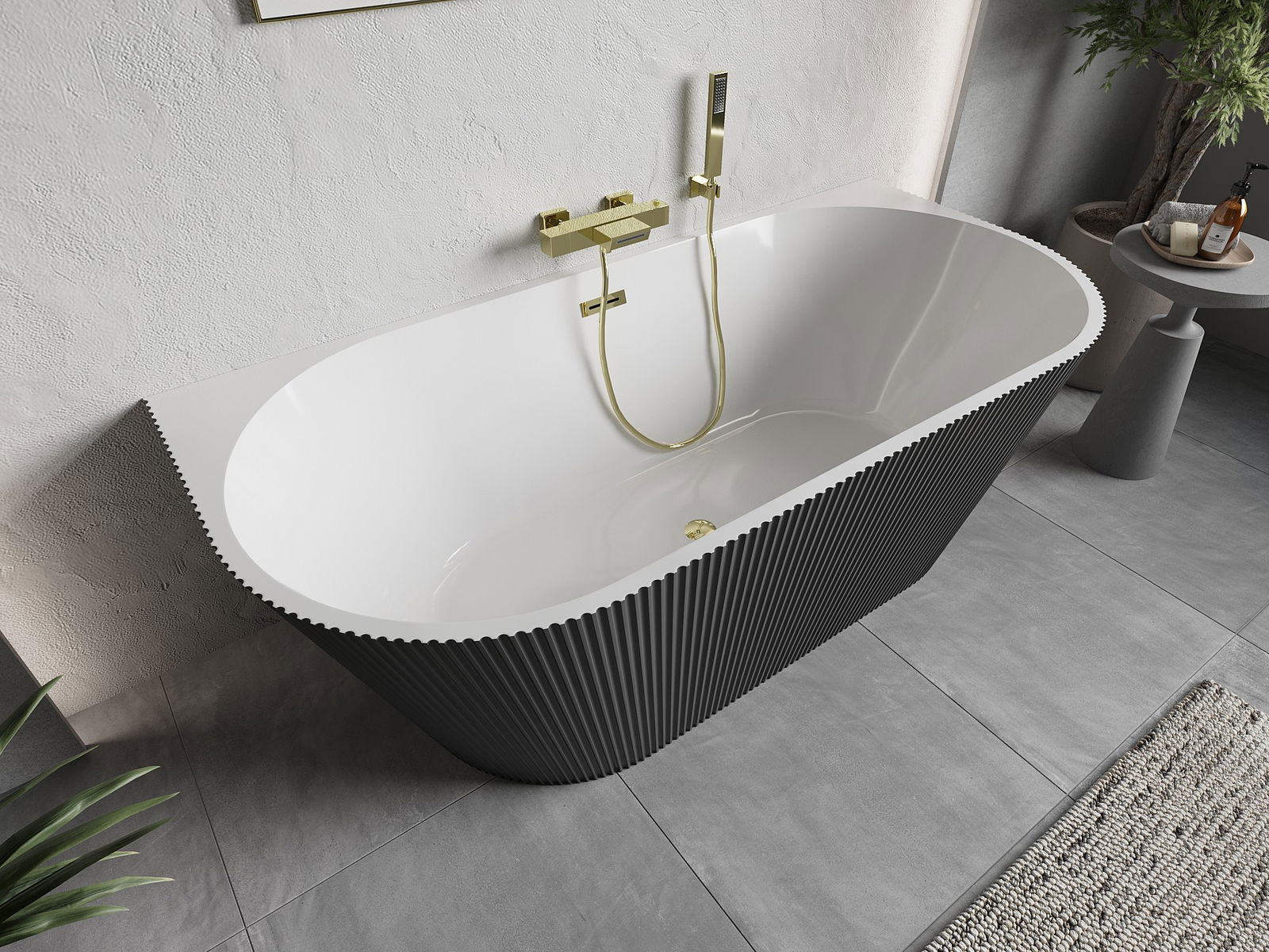 Mexen Oris Free-Standing Wall-Mounted Ribbed Bathtub 150 x 75 cm, White/Grey, Gold Overflow - 52871507562-50