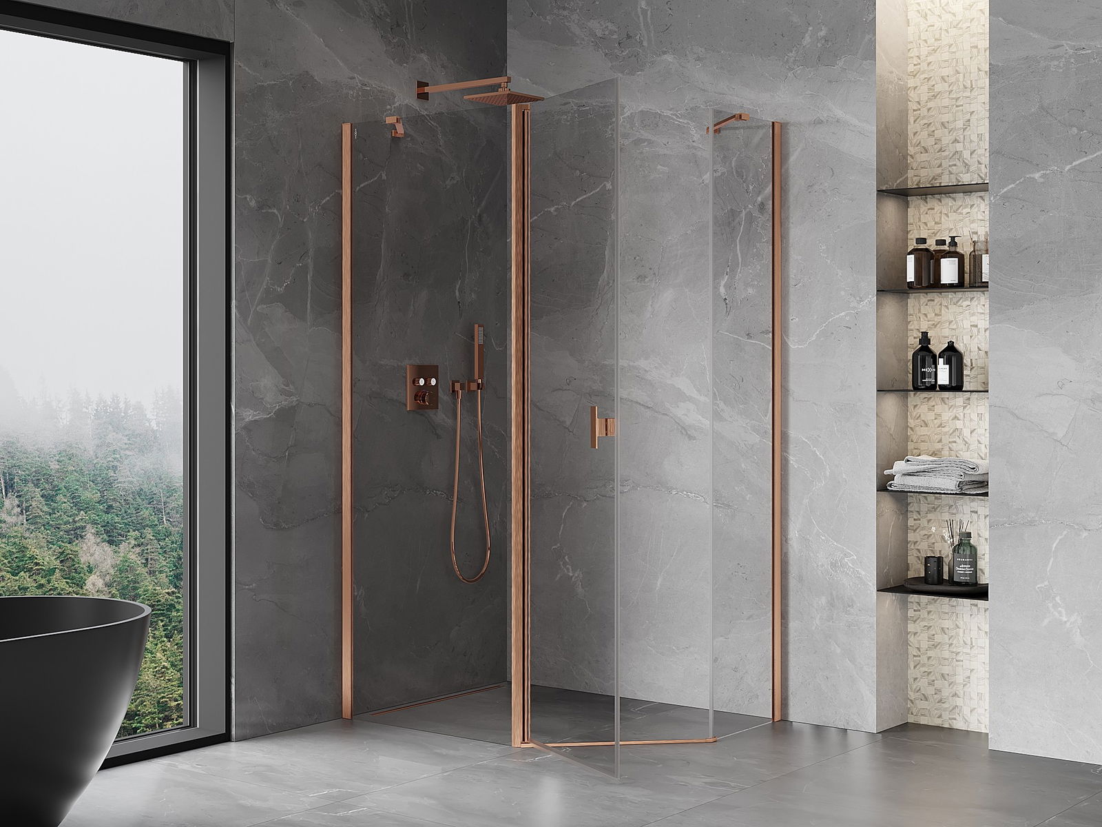 Mexen Mist asymmetrical pentagonal shower cabin with hinged door 90 x 80 cm, transparent, brushed copper - 8A8-090-080-65-00
