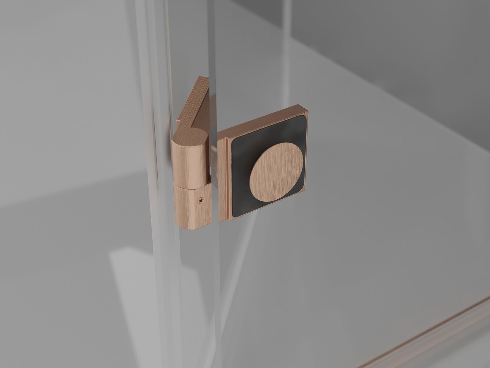 Brass hinges flush with the glass pane
