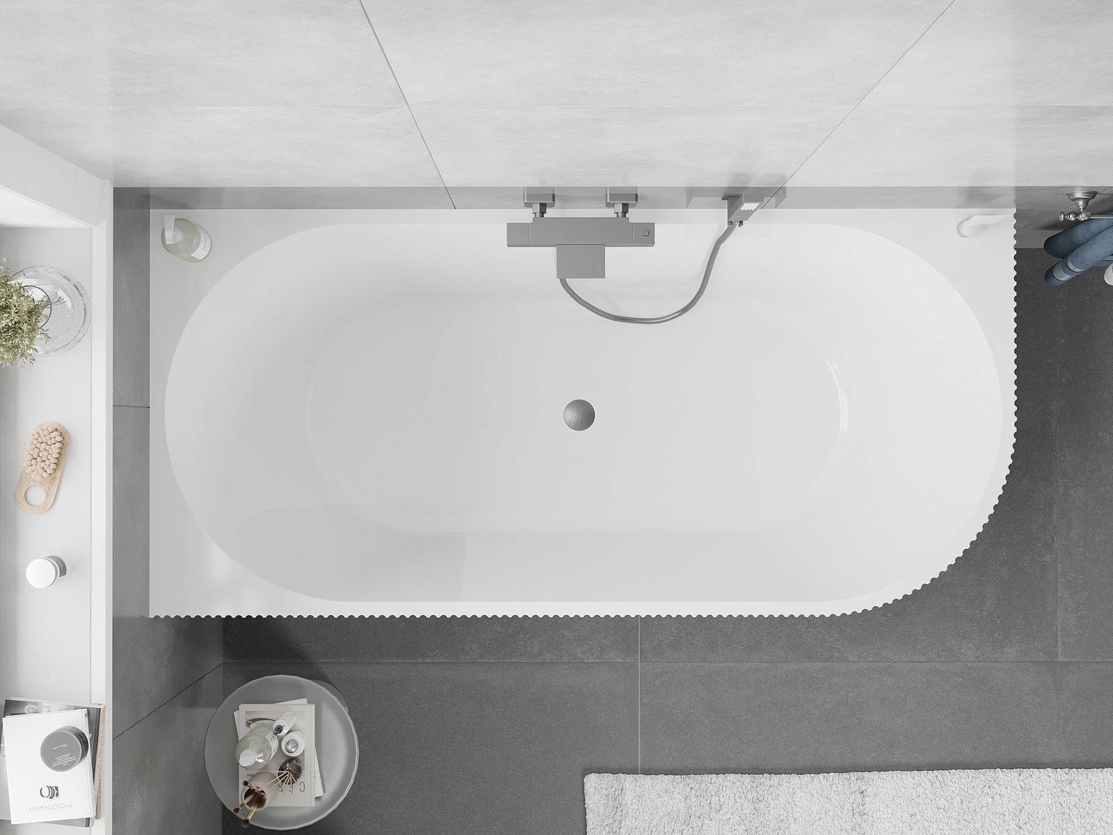 This is a modern material combining an elegant appearance with high durability. It is resistant to mechanical damage, easy to clean, and pleasant to the touch. The transparent form and thin rim of the bathtub add lightness and unique character, creating an impactful accent in bathroom design.