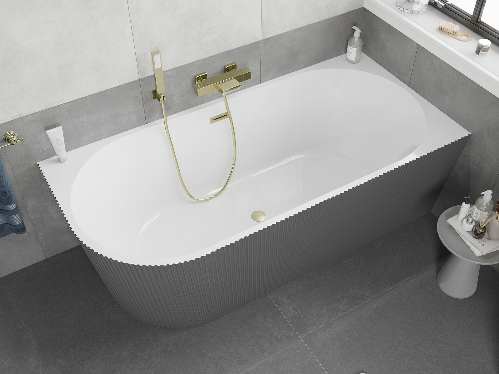 Mexen Silo freestanding corner bathtub right ribbed 150 x 75 cm, white/gray, overflow gold brushed - 52891507562P-55