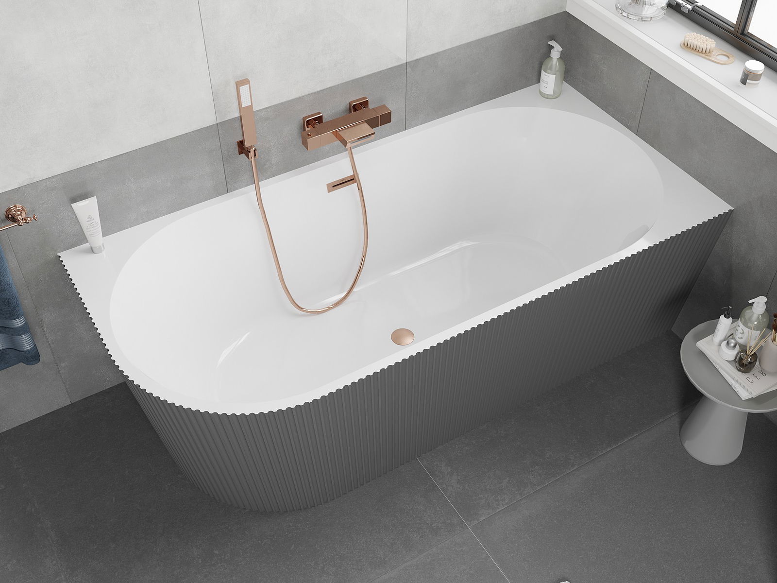 Mexen Silo freestanding corner bathtub right fluted 150 x 75 cm, white/gray, brushed copper overflow - 52891507562P-65