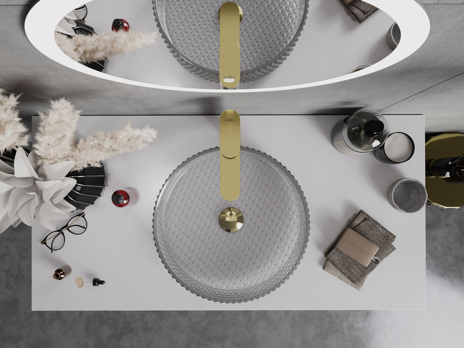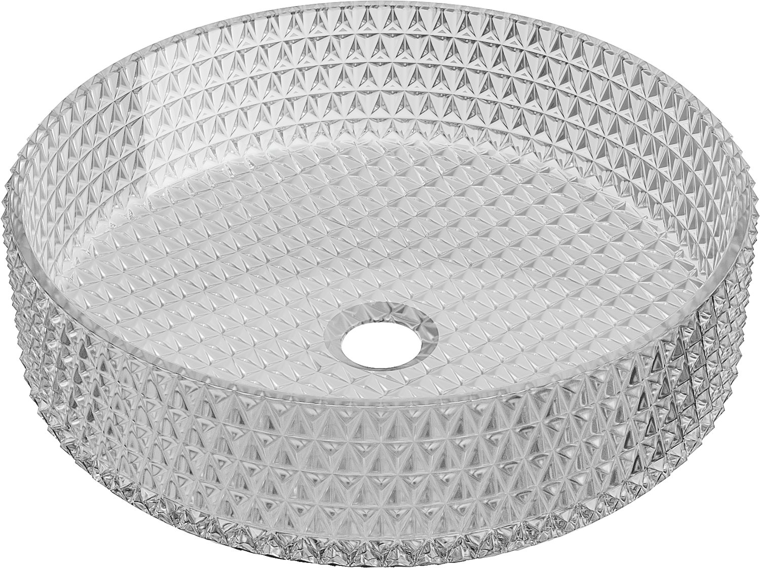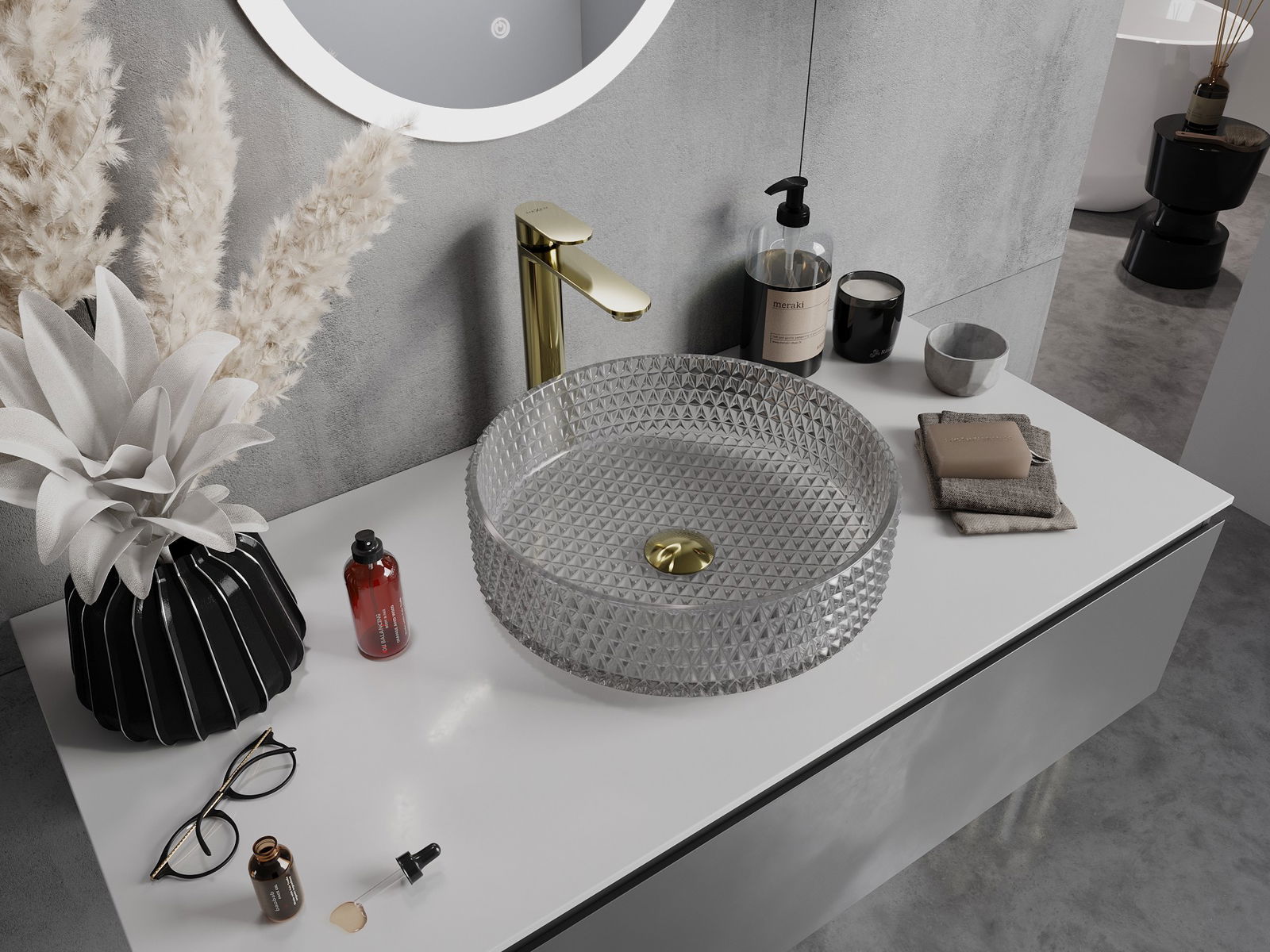 The washbasin features a unique crystal structure, giving it a distinctive and exceptionally striking appearance. The crystals shimmer in the light, catching the eye and adding elegance. A practical and stylish solution for any bathroom.