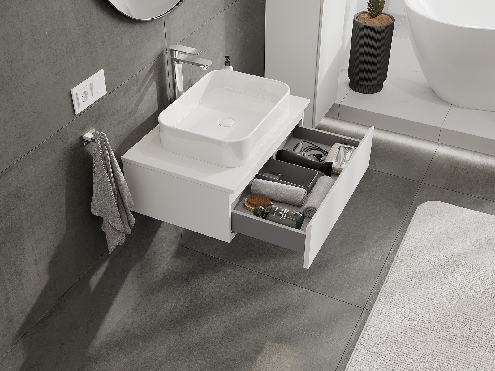 Our modular bathroom furniture can be combined in various colour configurations, allowing for complete personalisation. You can choose both the appearance and functions of individual elements, enabling you to adapt the furniture to your own stylistic and functional preferences.
