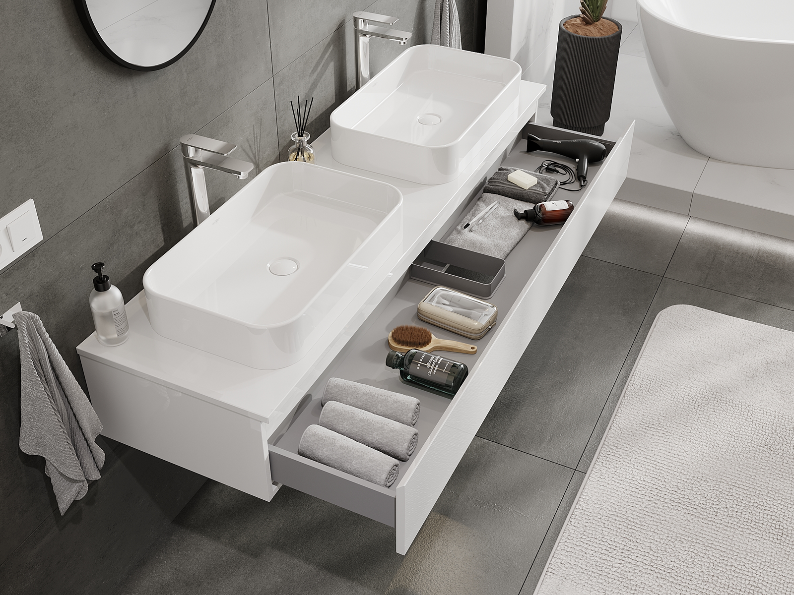 Our modular bathroom furniture can be combined in various colour configurations, allowing for complete personalisation. You can choose both the appearance and functions of individual elements, enabling you to adapt the furniture to your own stylistic and functional preferences.