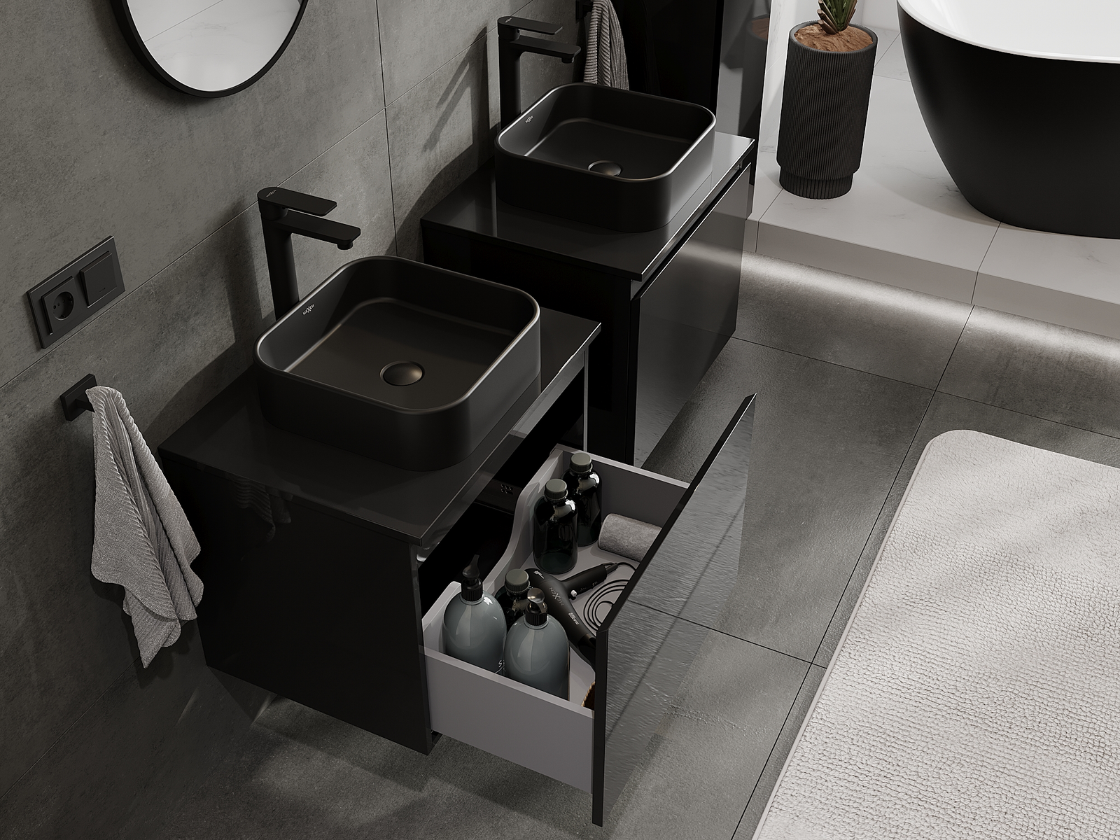 Our modular bathroom furniture can be combined in various colour configurations, allowing for complete personalisation. You can choose both the appearance and functions of individual elements, enabling you to adapt the furniture to your own stylistic and functional preferences.