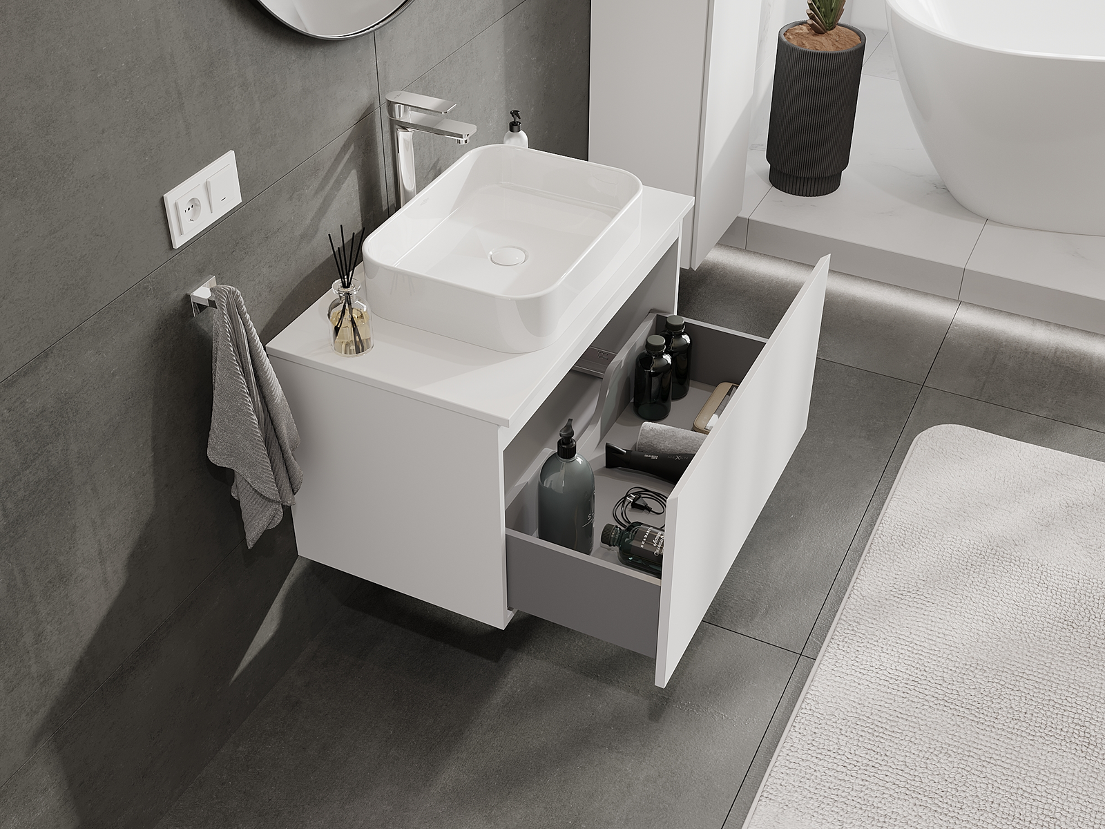 Our modular bathroom furniture can be combined in various colour configurations, allowing for complete personalisation. You can choose both the appearance and functions of individual elements, enabling you to adapt the furniture to your own stylistic and functional preferences.