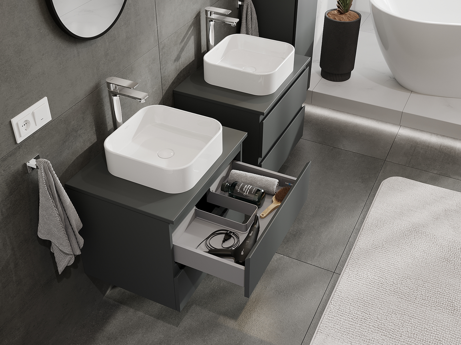 Our modular bathroom furniture can be combined in various colour configurations, allowing for complete personalisation. You can choose both the appearance and functions of individual elements, enabling you to adapt the furniture to your own stylistic and functional preferences.