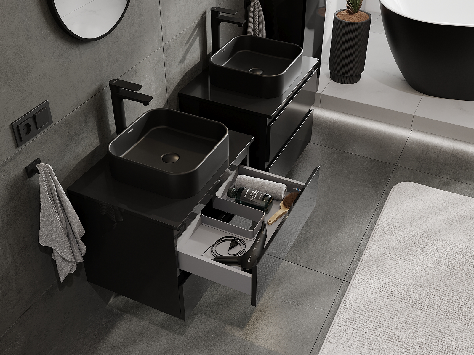 Our modular bathroom furniture can be combined in various colour configurations, allowing for complete personalisation. You can choose both the appearance and functions of individual elements, enabling you to adapt the furniture to your own stylistic and functional preferences.