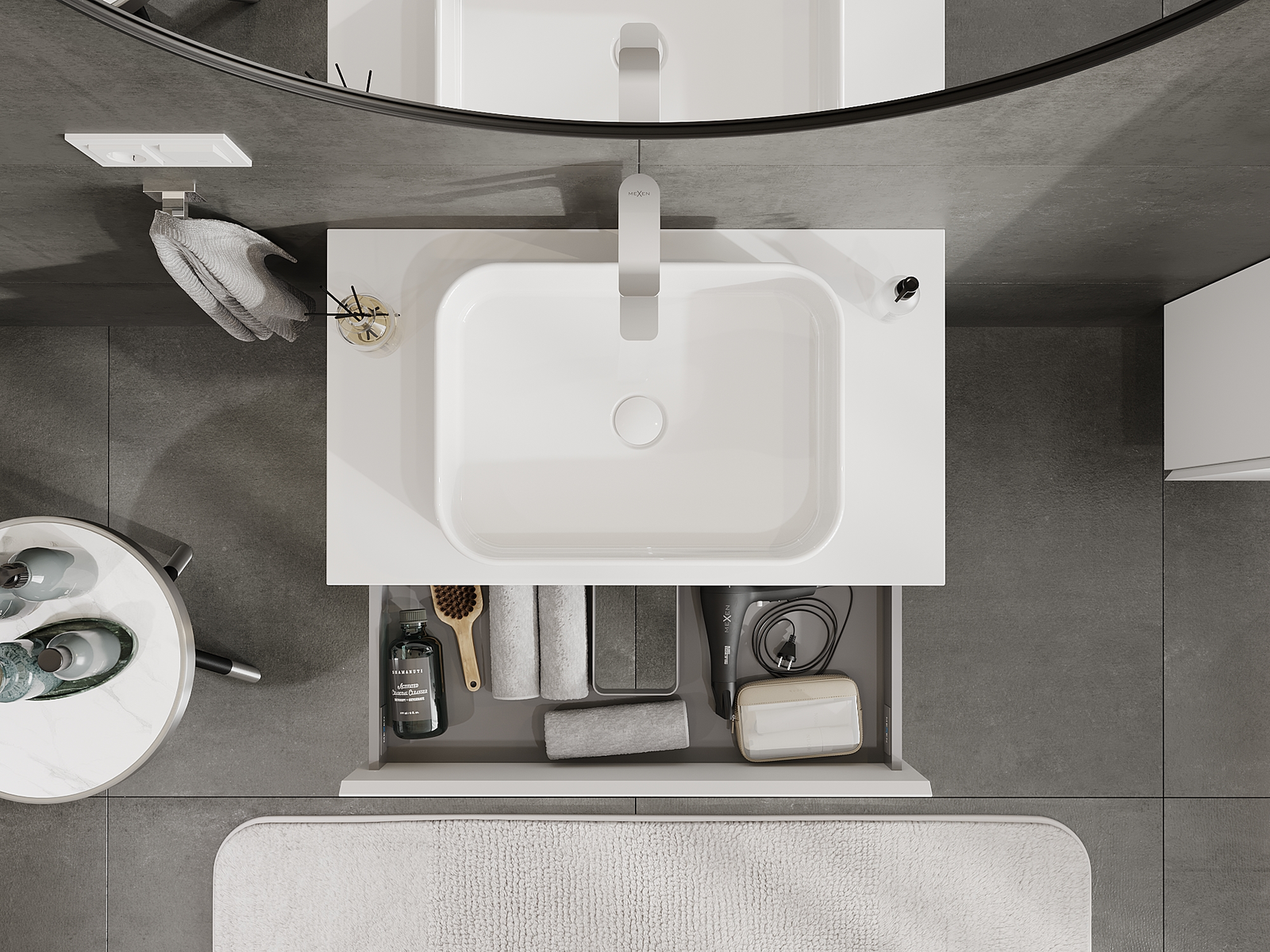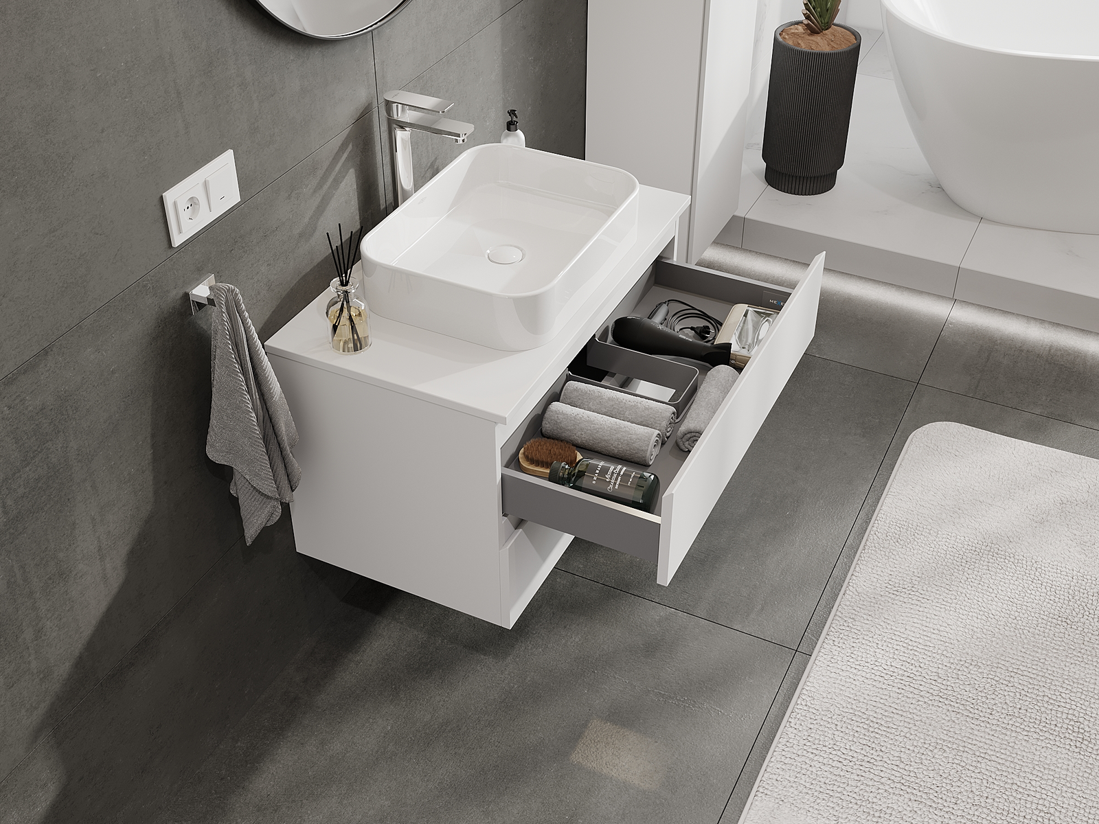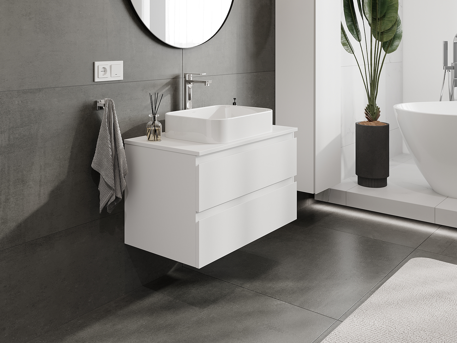 Our modular bathroom furniture can be combined in various colour configurations, allowing for complete personalisation. You can choose both the appearance and functions of individual elements, enabling you to adapt the furniture to your own stylistic and functional preferences.