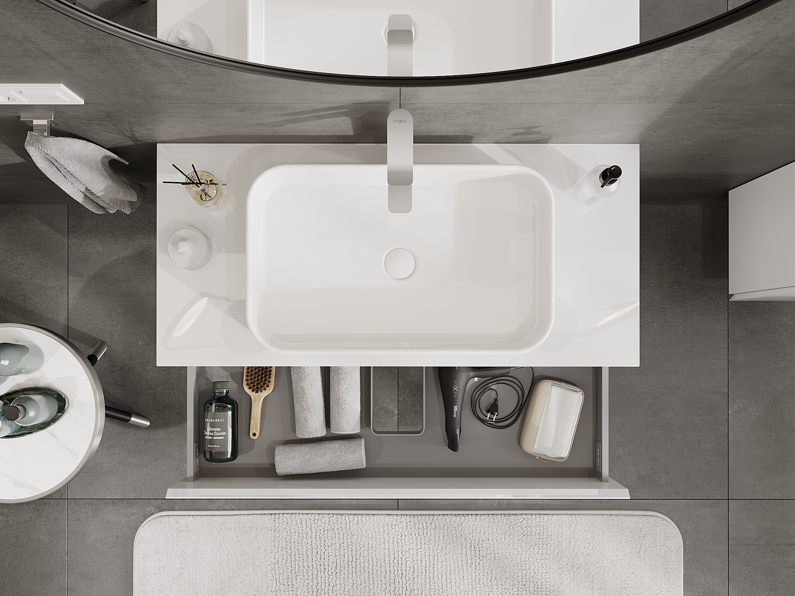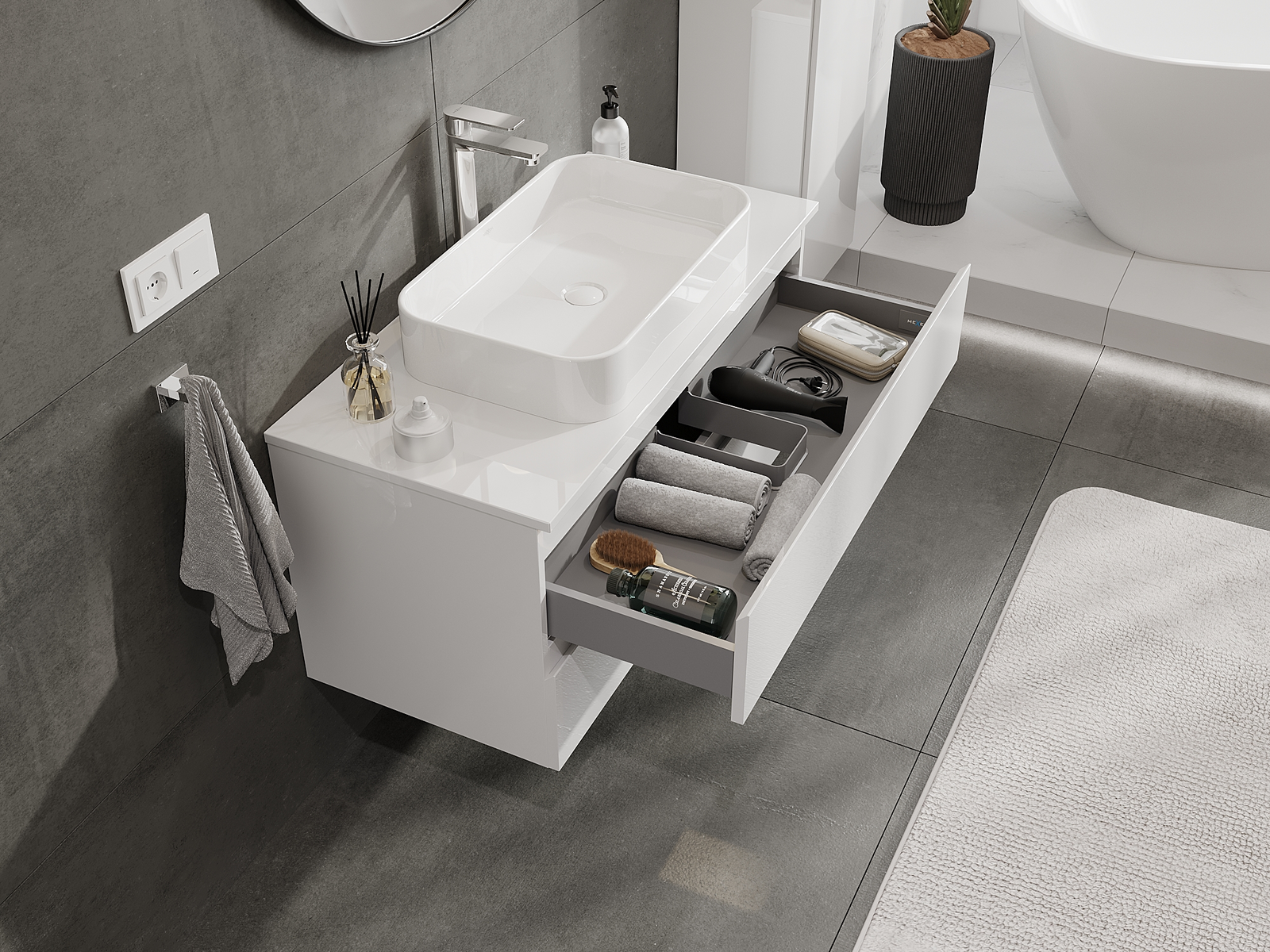 Our modular bathroom furniture can be combined in various colour configurations, allowing for complete personalisation. You can choose both the appearance and functions of individual elements, enabling you to adapt the furniture to your own stylistic and functional preferences.