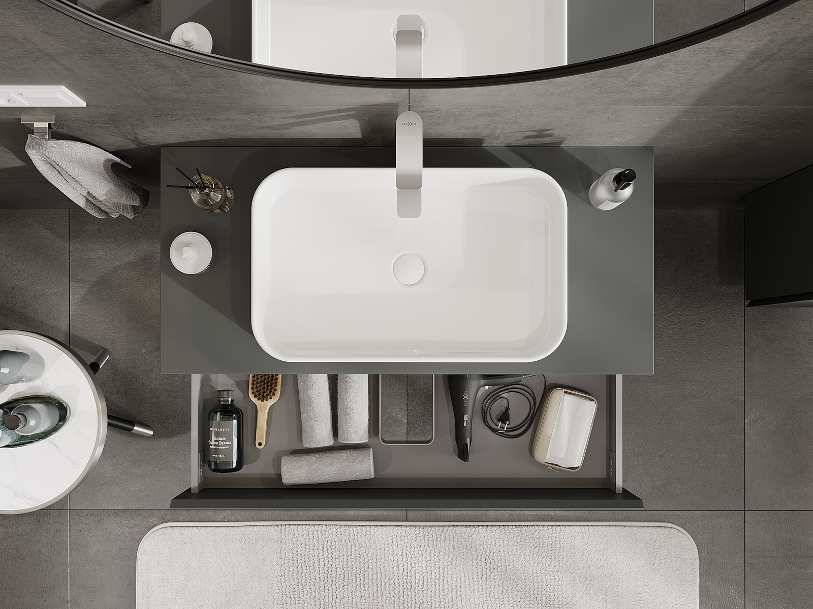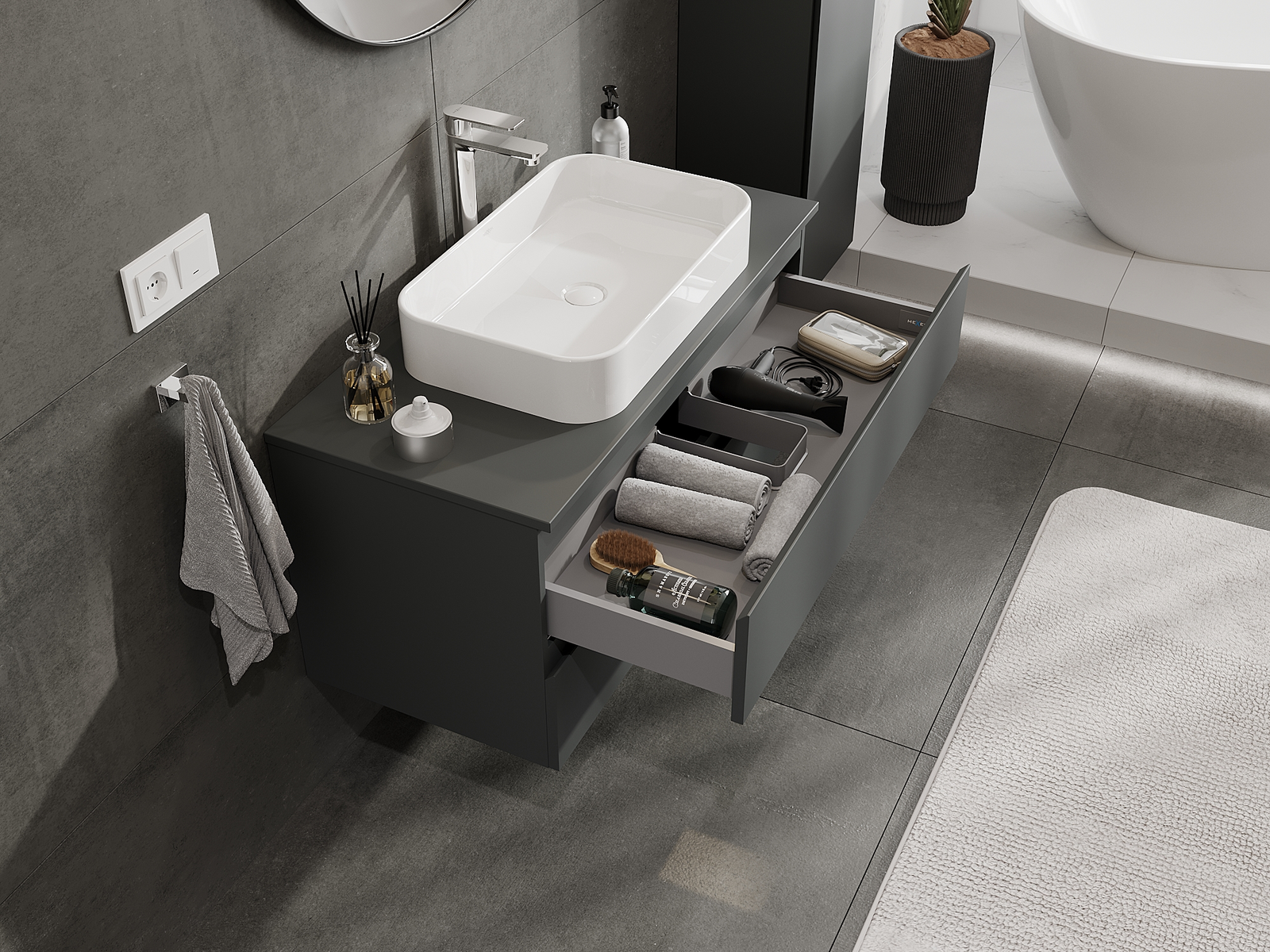 Our modular bathroom furniture can be combined in various colour configurations, allowing for complete personalisation. You can choose both the appearance and functions of individual elements, enabling you to adapt the furniture to your own stylistic and functional preferences.