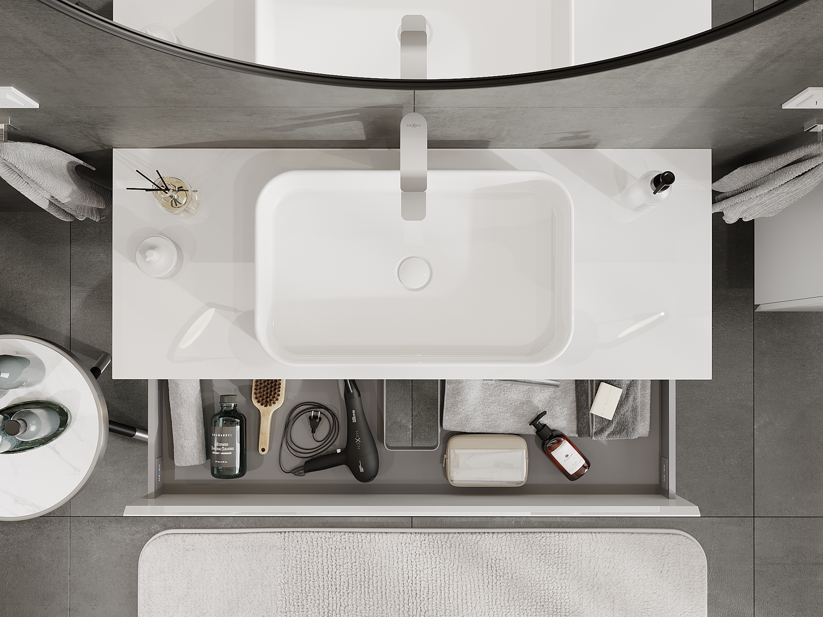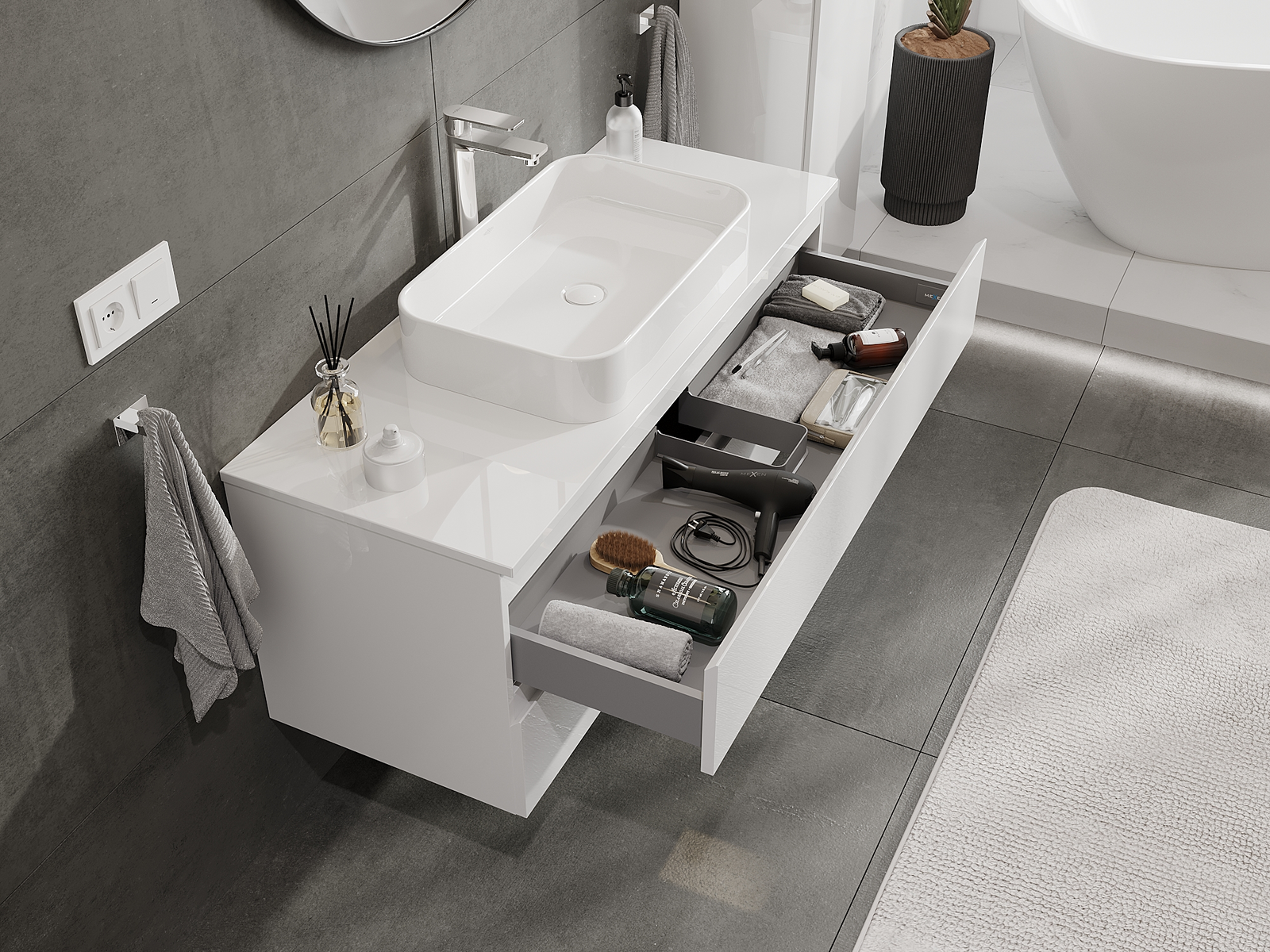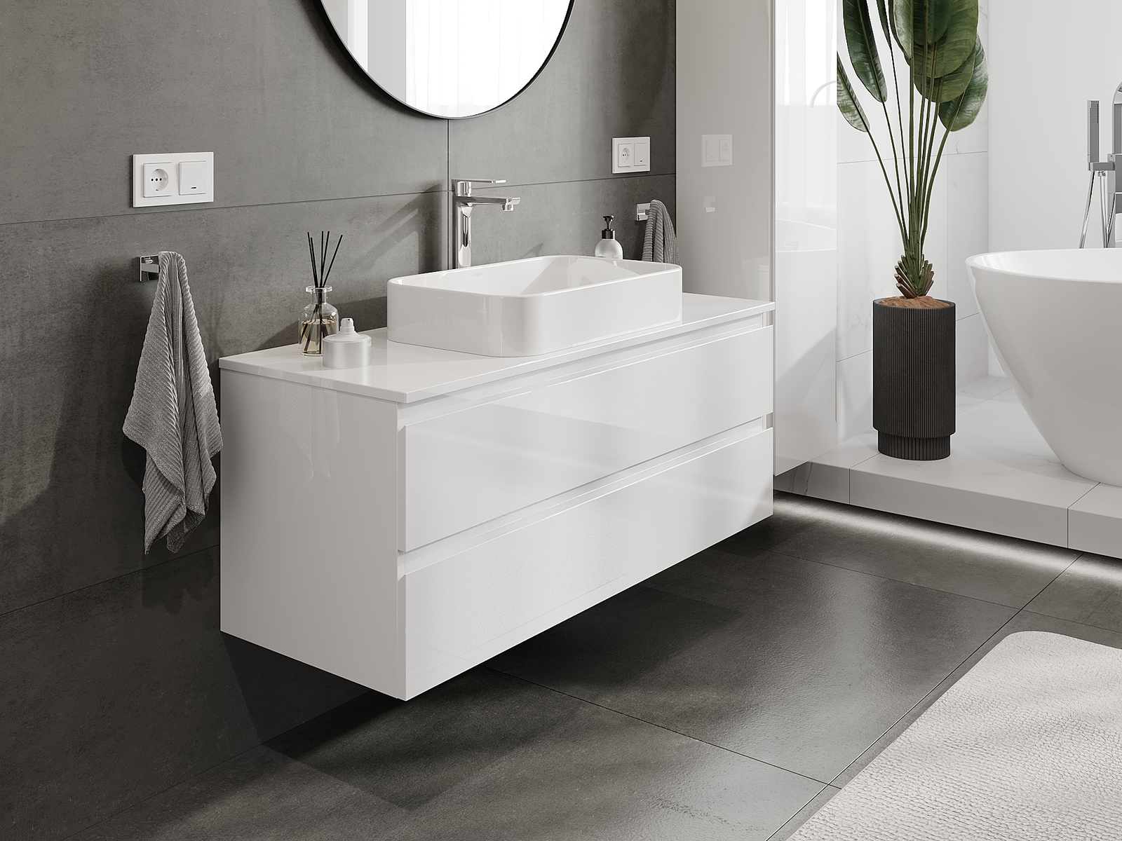 Our modular bathroom furniture can be combined in various colour configurations, allowing for complete personalisation. You can choose both the appearance and functions of individual elements, enabling you to adapt the furniture to your own stylistic and functional preferences.
