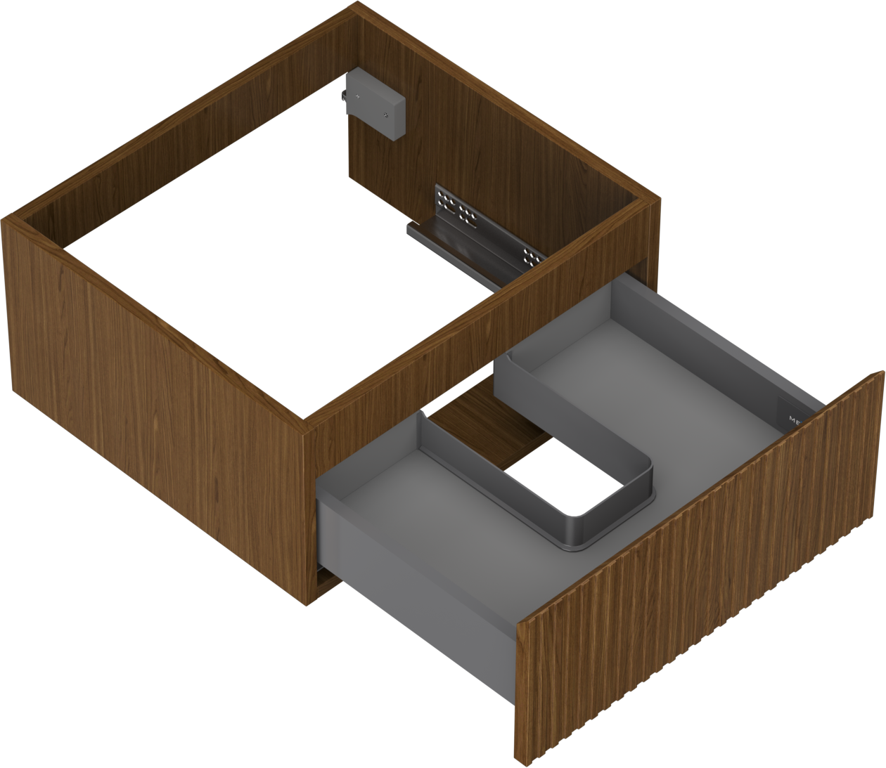 The cutout in the drawer is designed in such a way as to accommodate the siphon, which is essential in sink installations. This allows the furniture to be fully functional without having to give up drawer space for the installation.