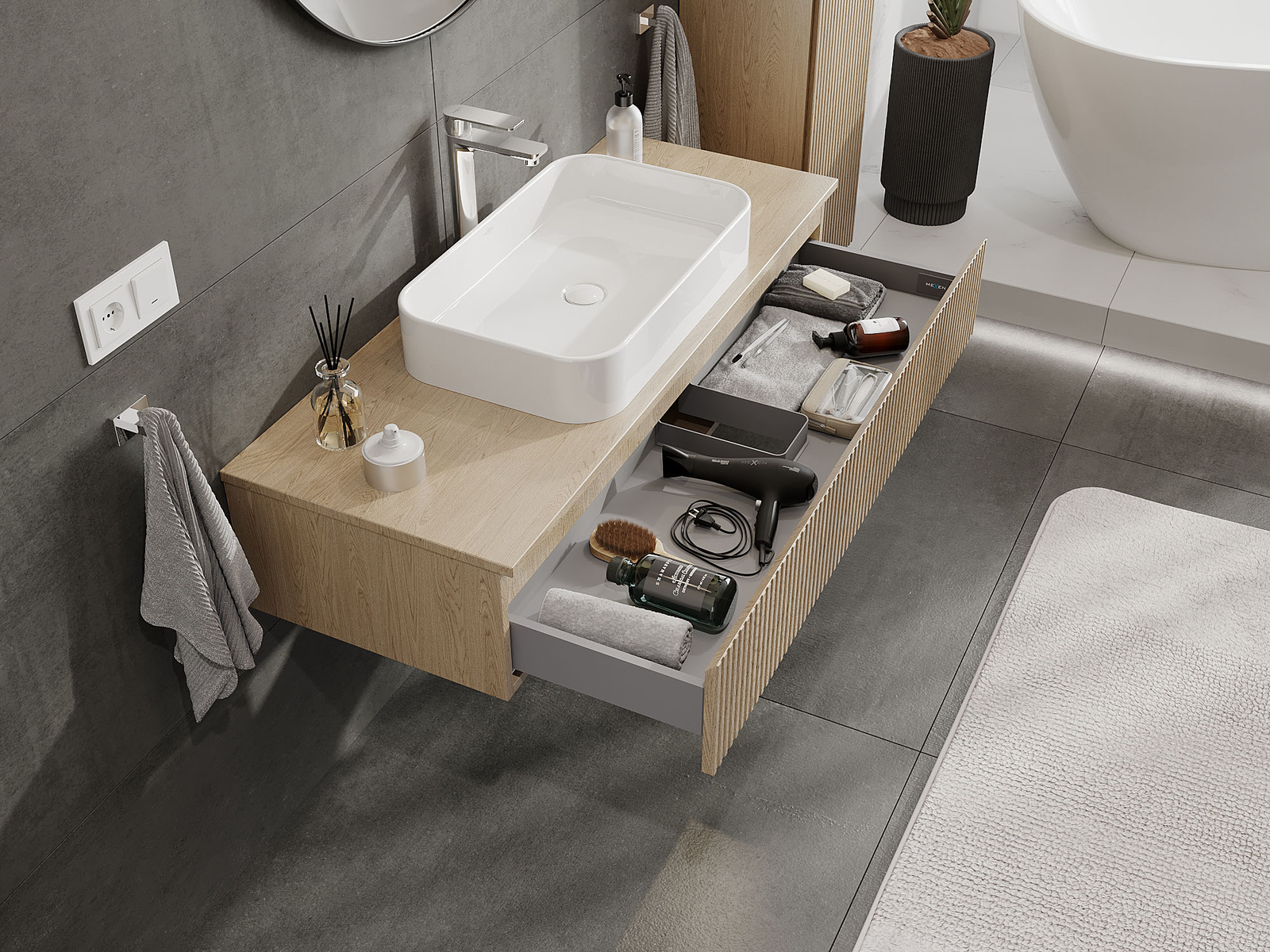Our modular bathroom furniture can be combined in various colour configurations, allowing for complete personalisation. You can choose both the appearance and functions of individual elements, enabling you to adapt the furniture to your own stylistic and functional preferences.