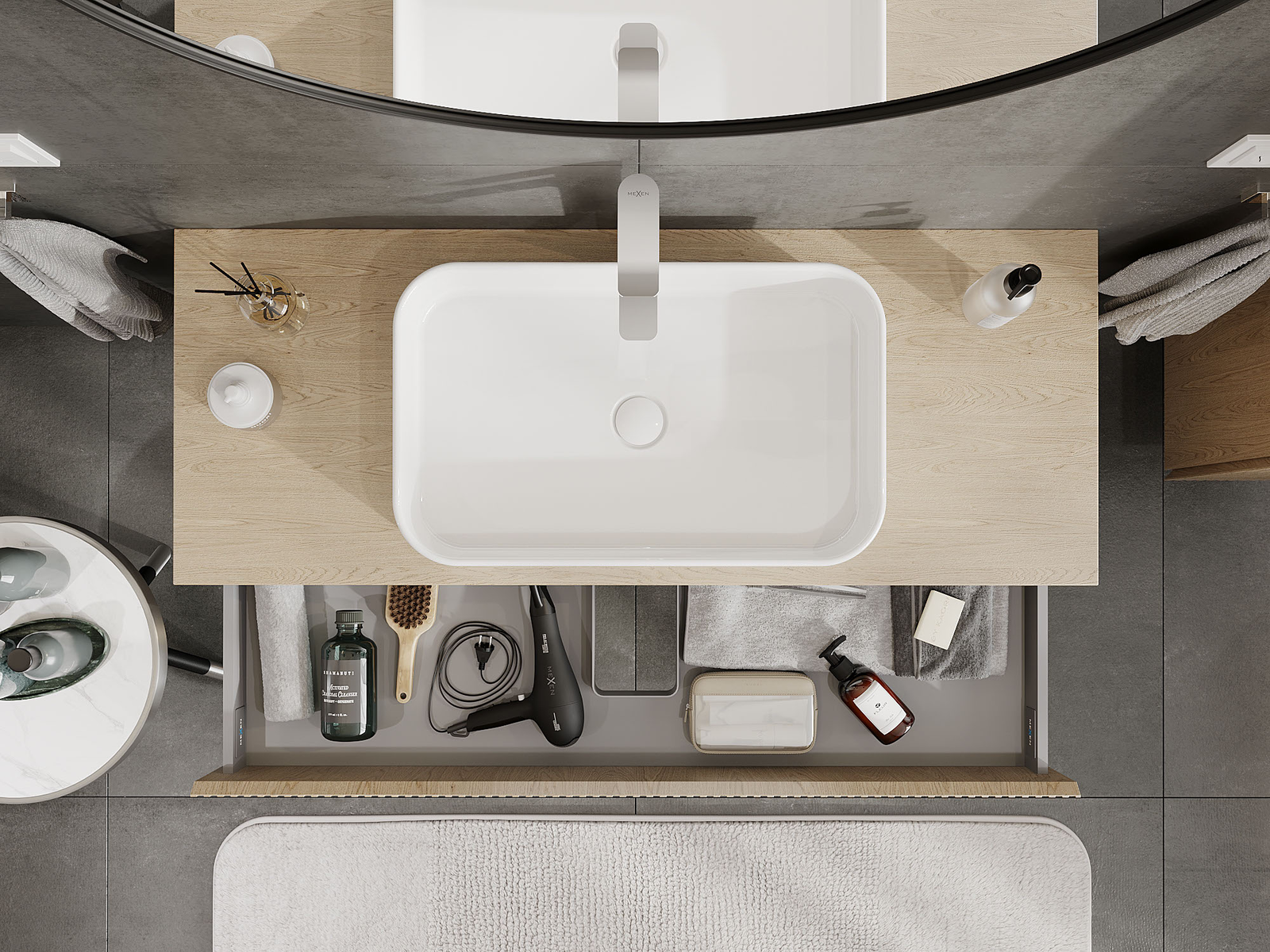 The cutout in the drawer is designed in such a way as to accommodate the siphon, which is essential in sink installations. This allows the furniture to be fully functional without having to give up drawer space for the installation.