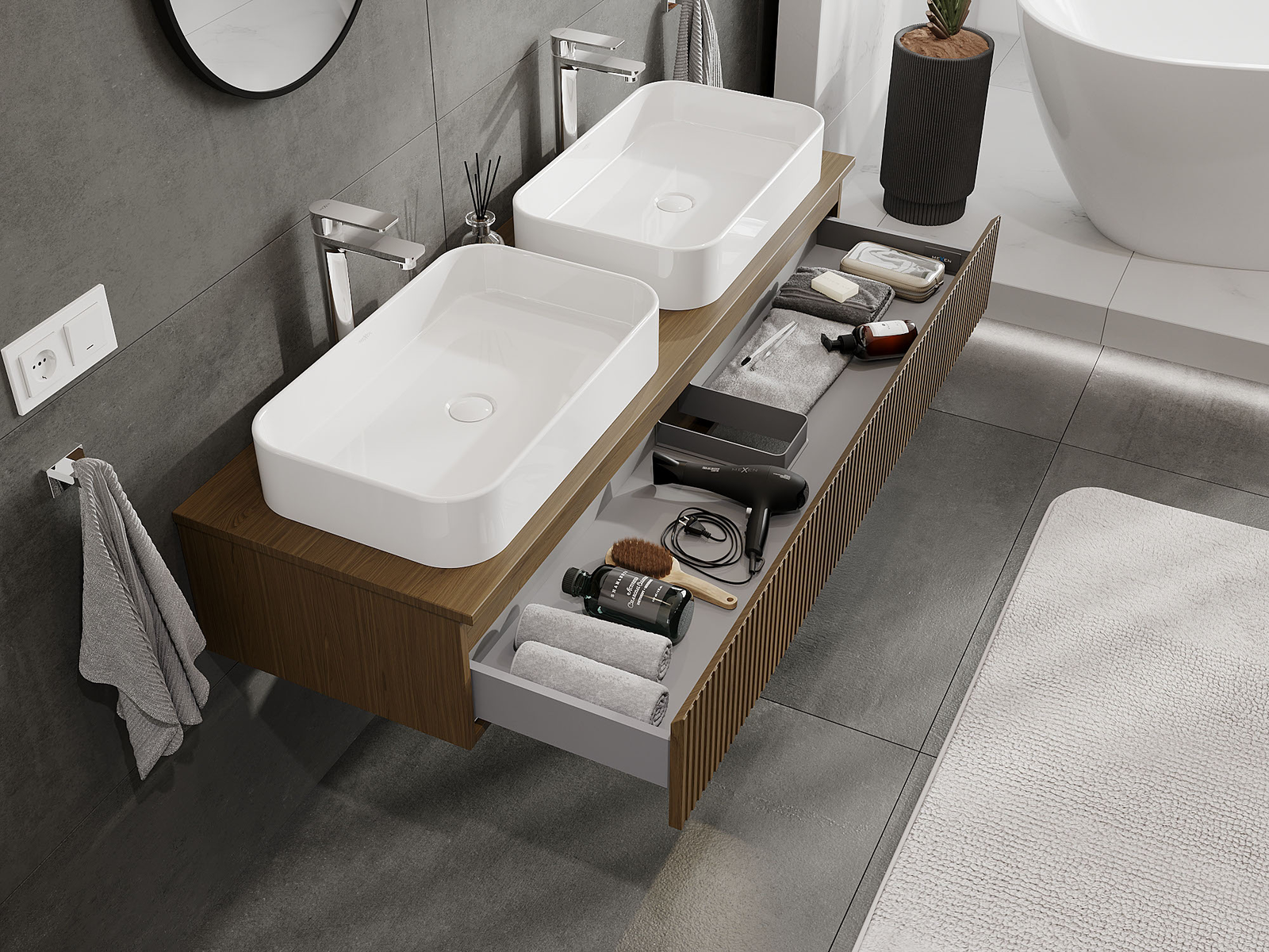 Our modular bathroom furniture can be combined in various colour configurations, allowing for complete personalisation. You can choose both the appearance and functions of individual elements, enabling you to adapt the furniture to your own stylistic and functional preferences.