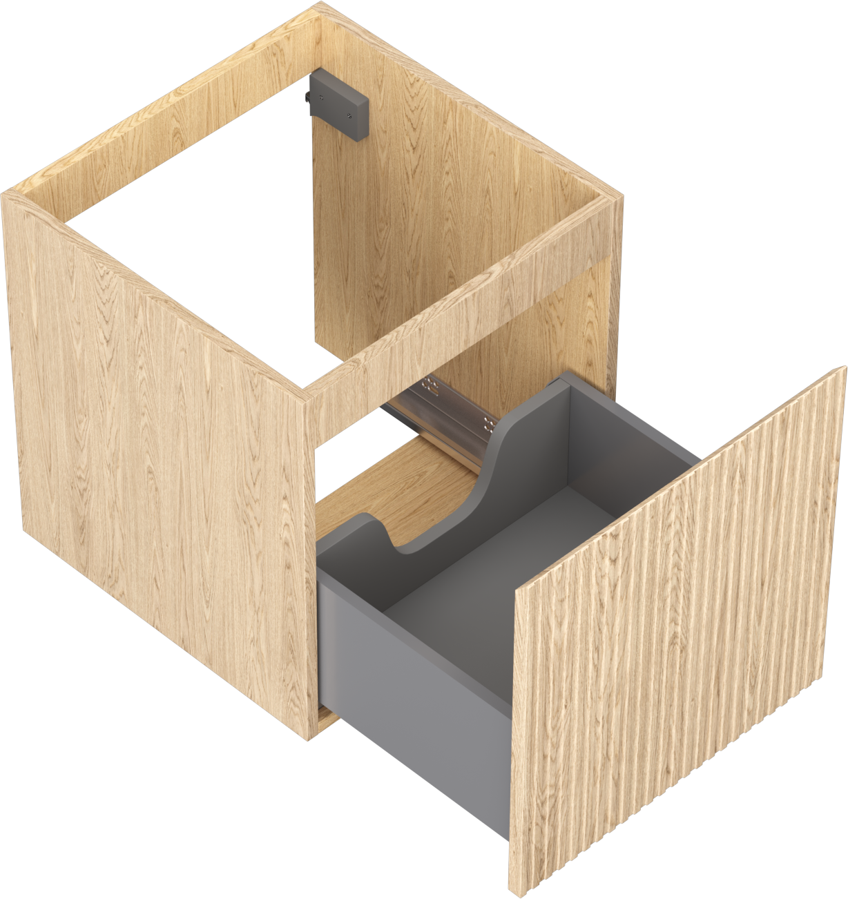 The cutout in the drawer is designed in such a way as to accommodate the siphon, which is essential in sink installations. This allows the furniture to be fully functional without having to give up drawer space for the installation.