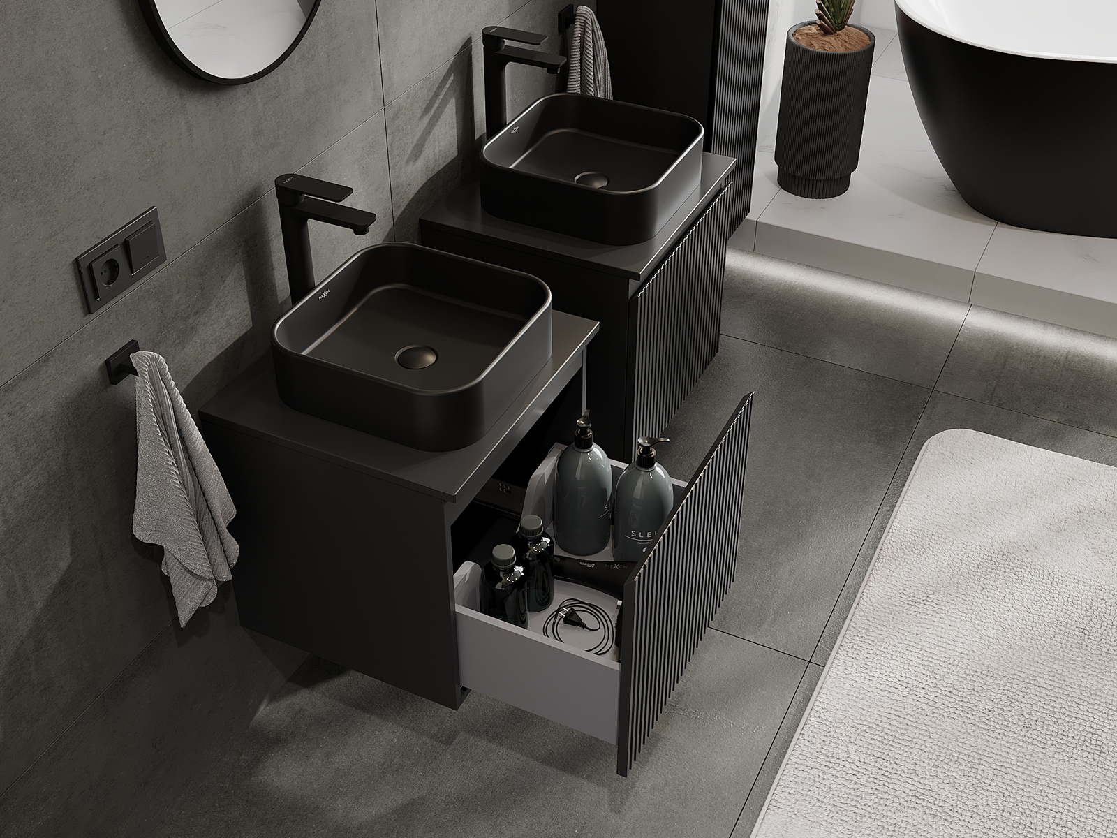 Our modular bathroom furniture can be combined in various colour configurations, allowing for complete personalisation. You can choose both the appearance and functions of individual elements, enabling you to adapt the furniture to your own stylistic and functional preferences.