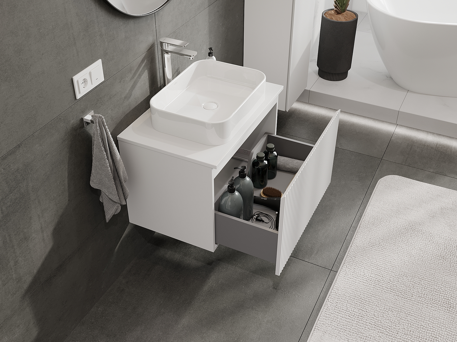 Our modular bathroom furniture can be combined in various colour configurations, allowing for complete personalisation. You can choose both the appearance and functions of individual elements, enabling you to adapt the furniture to your own stylistic and functional preferences.