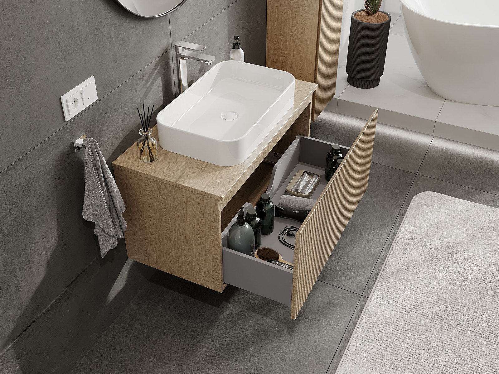 Our modular bathroom furniture can be combined in various colour configurations, allowing for complete personalisation. You can choose both the appearance and functions of individual elements, enabling you to adapt the furniture to your own stylistic and functional preferences.