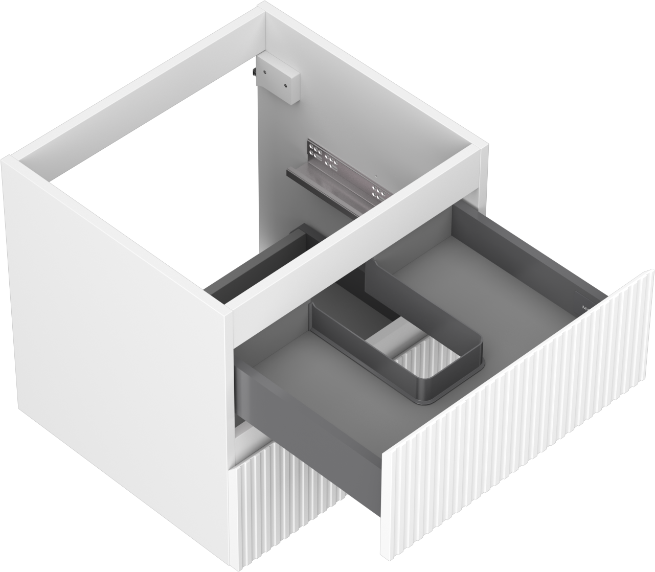The cutout in the drawer is designed in such a way as to accommodate the siphon, which is essential in sink installations. This allows the furniture to be fully functional without having to give up drawer space for the installation.