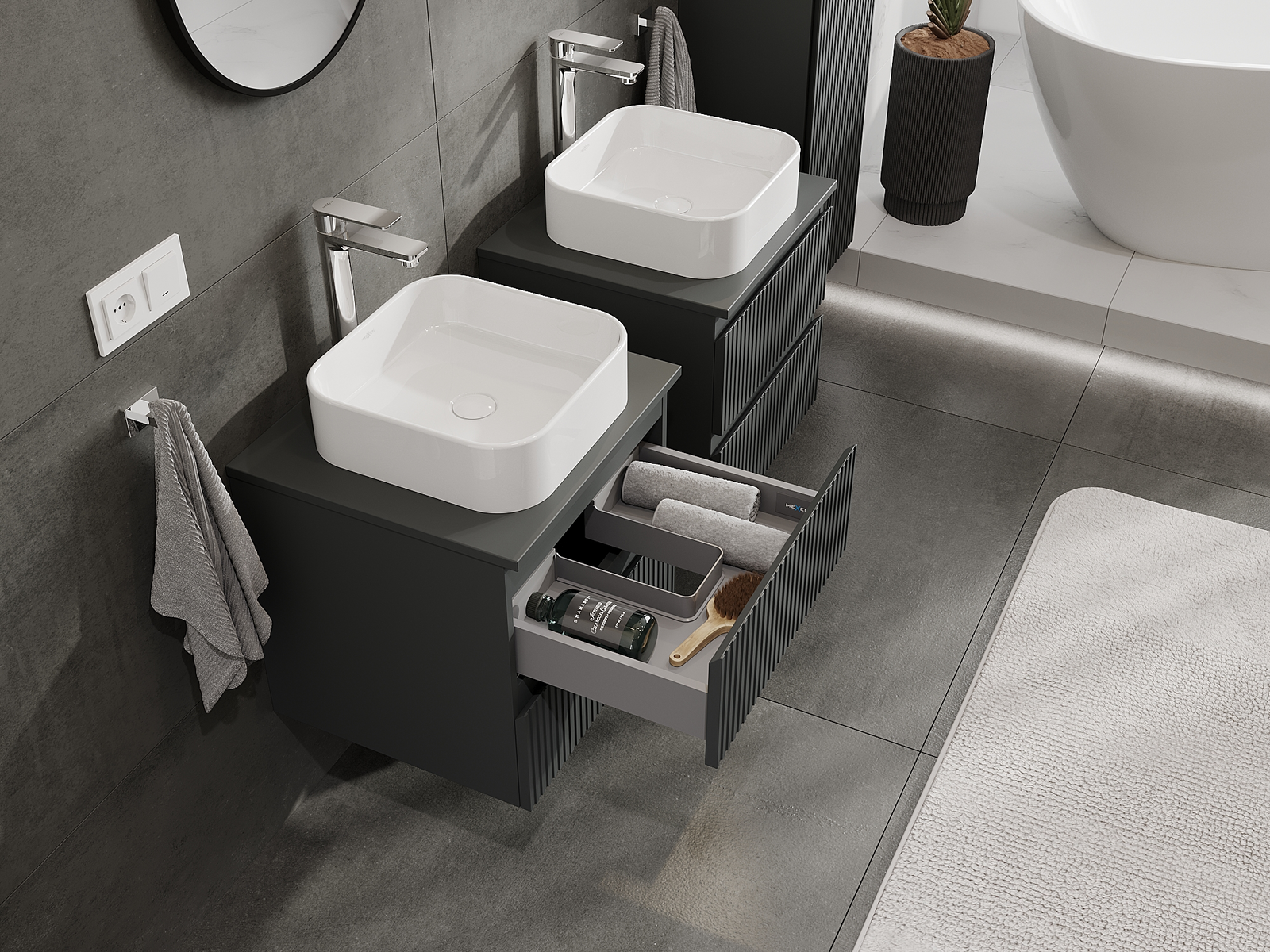 Our modular bathroom furniture can be combined in various colour configurations, allowing for complete personalisation. You can choose both the appearance and functions of individual elements, enabling you to adapt the furniture to your own stylistic and functional preferences.