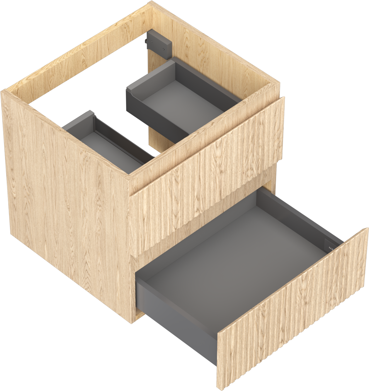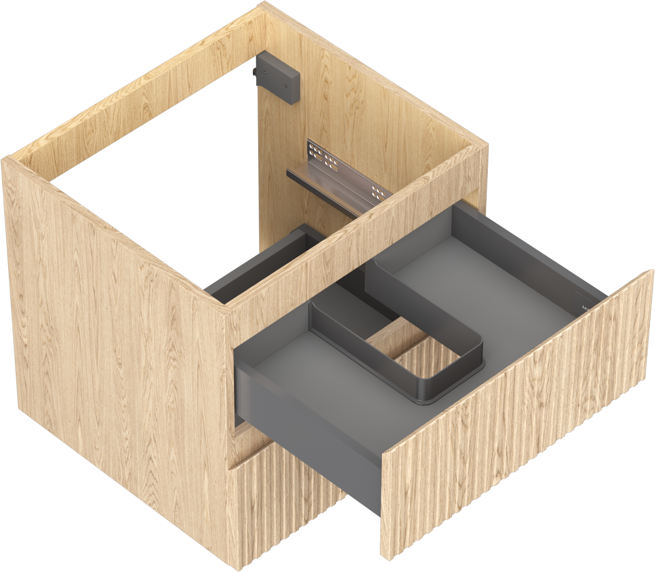 The cutout in the drawer is designed in such a way as to accommodate the siphon, which is essential in sink installations. This allows the furniture to be fully functional without having to give up drawer space for the installation.