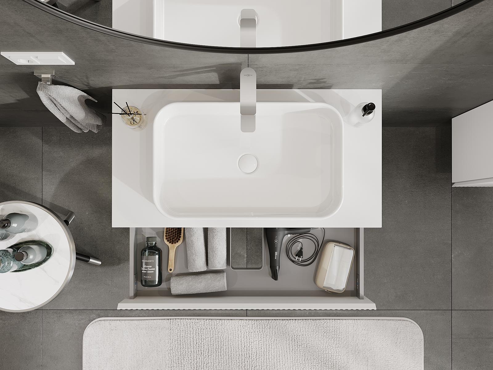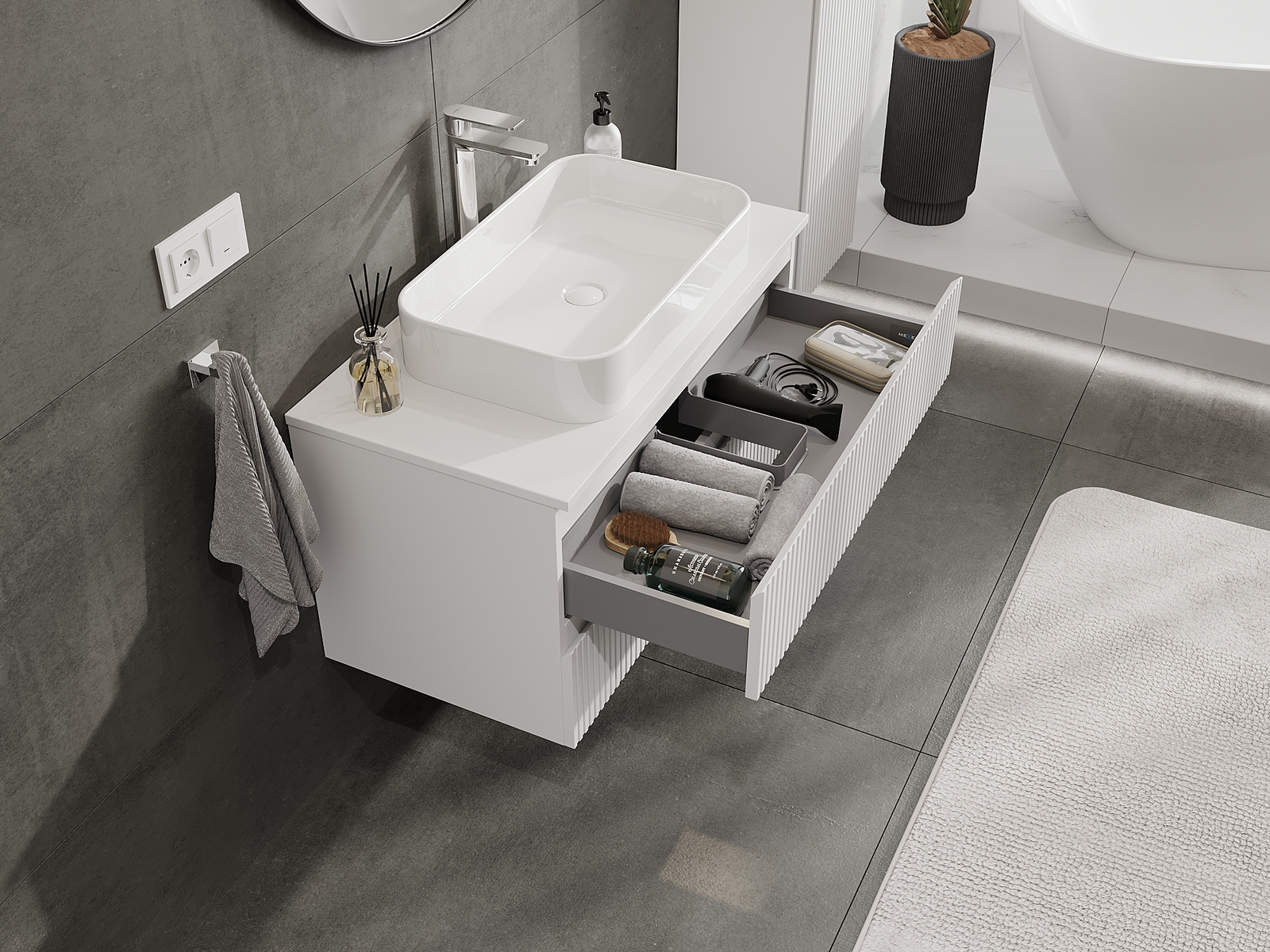 Our modular bathroom furniture can be combined in various colour configurations, allowing for complete personalisation. You can choose both the appearance and functions of individual elements, enabling you to adapt the furniture to your own stylistic and functional preferences.