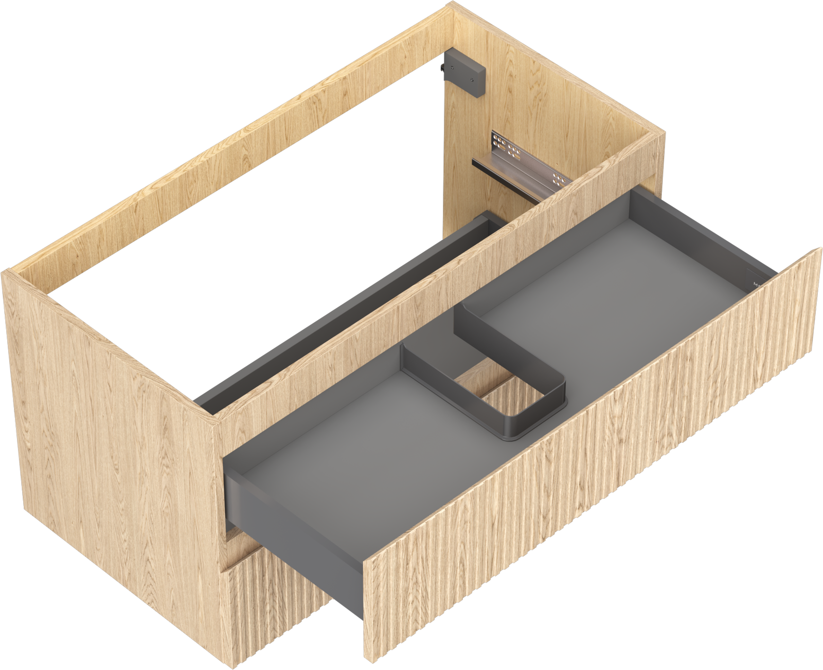 The cutout in the drawer is designed in such a way as to accommodate the siphon, which is essential in sink installations. This allows the furniture to be fully functional without having to give up drawer space for the installation.