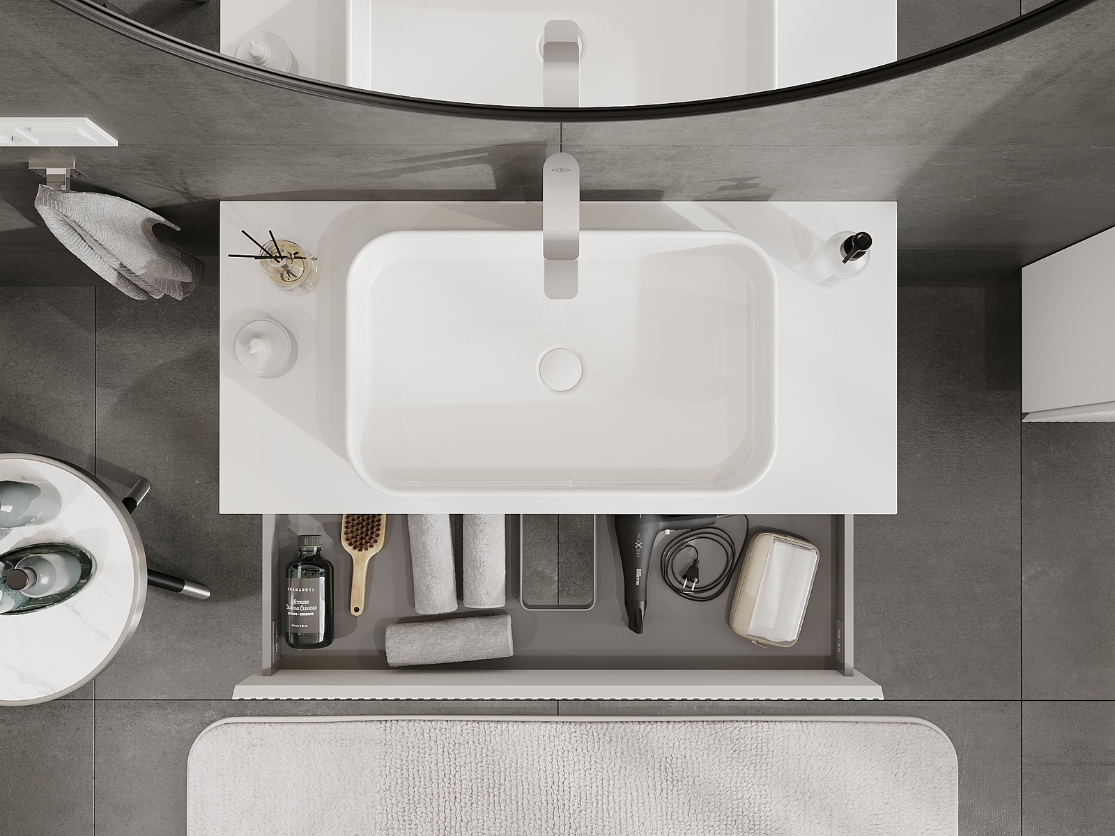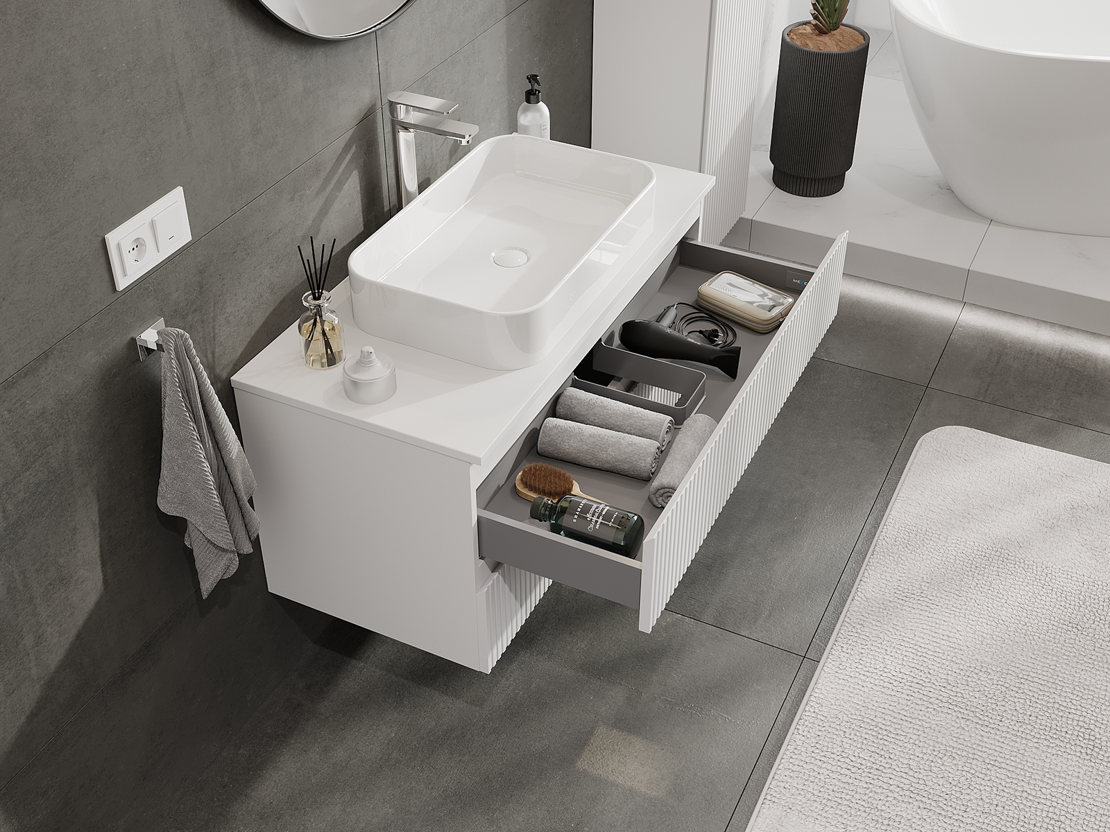 Our modular bathroom furniture can be combined in various colour configurations, allowing for complete personalisation. You can choose both the appearance and functions of individual elements, enabling you to adapt the furniture to your own stylistic and functional preferences.
