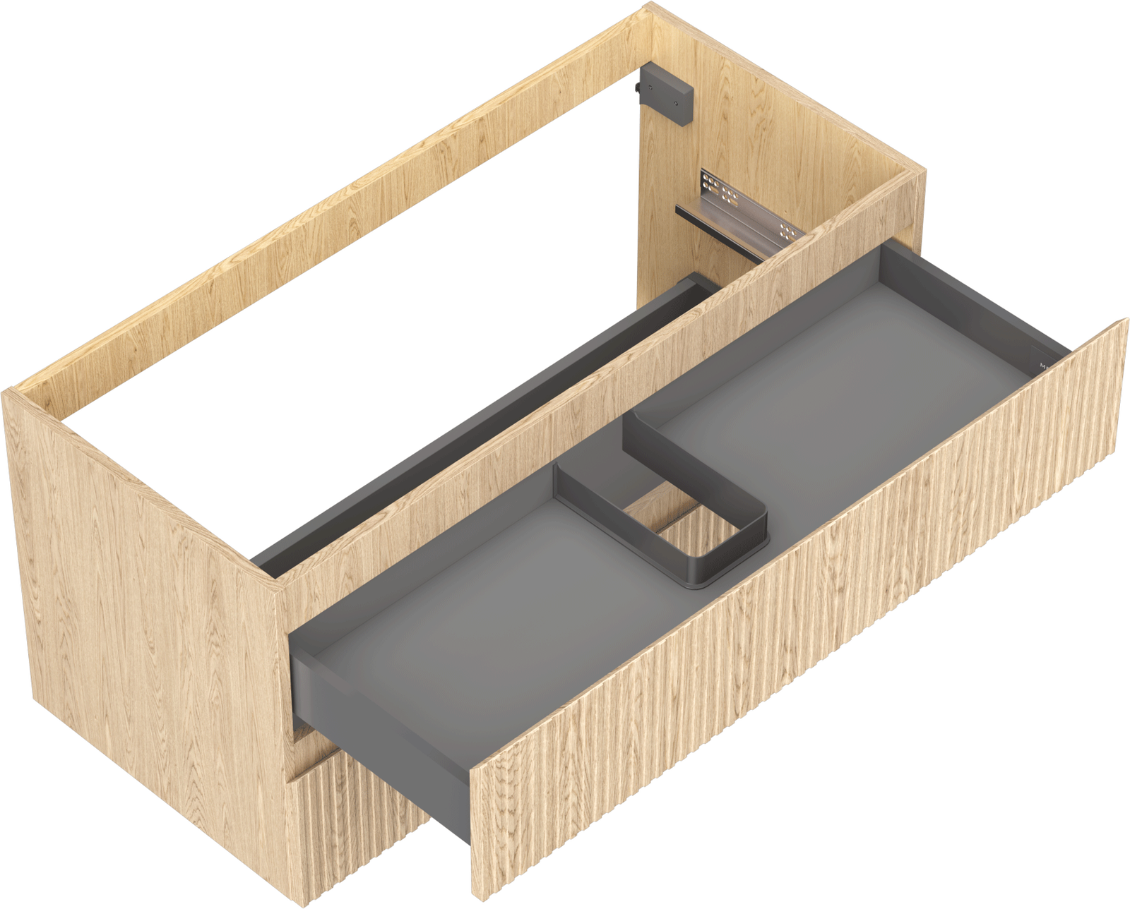 The cutout in the drawer is designed in such a way as to accommodate the siphon, which is essential in sink installations. This allows the furniture to be fully functional without having to give up drawer space for the installation.